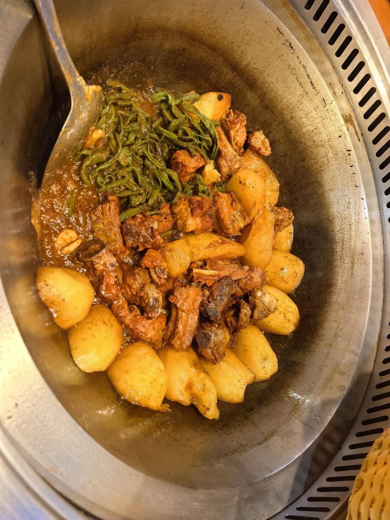 铁锅贴的苞米面大饼子,铁锅炖的排骨、土豆、干豆角外加宽粉,还有用煮熟的鹅蛋拌的凉菜,虽然说比不上山珍海味的档次,但这实惠劲儿,这浓浓的乡土味儿,光是怀旧就能让自己吃到肚皮撑。
