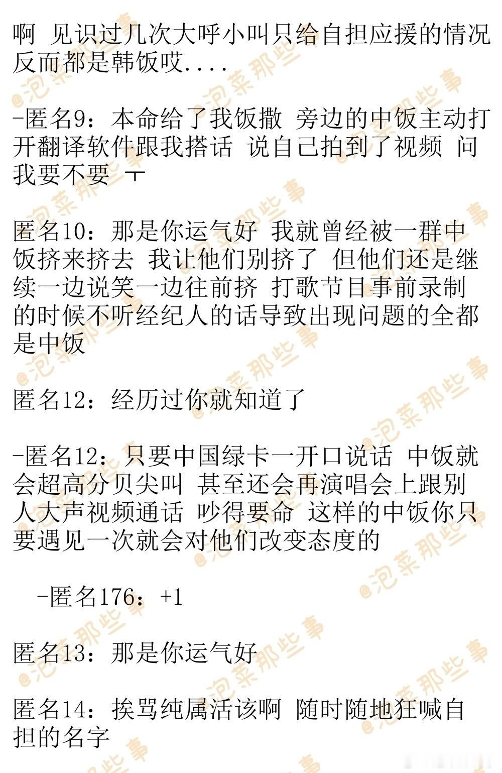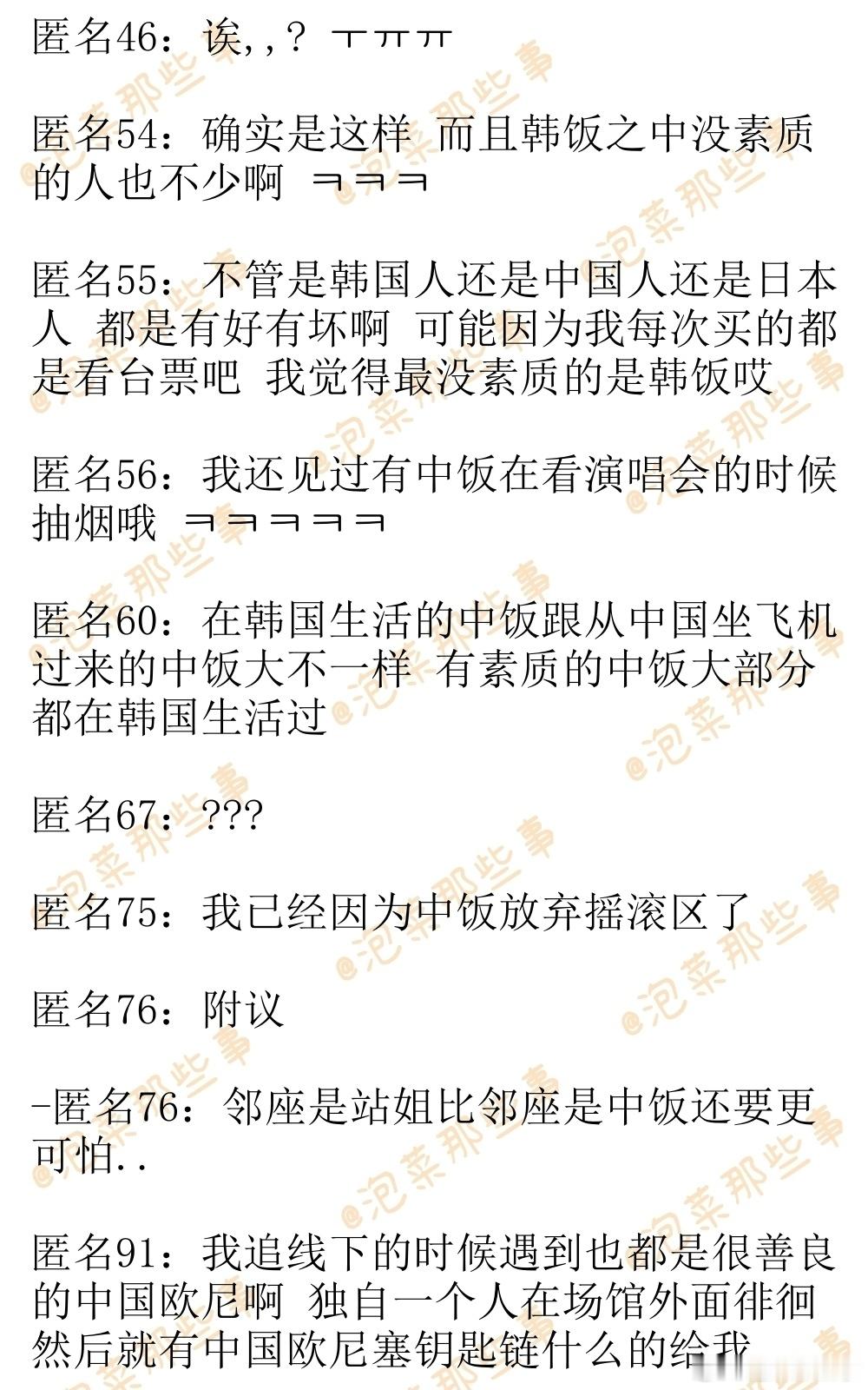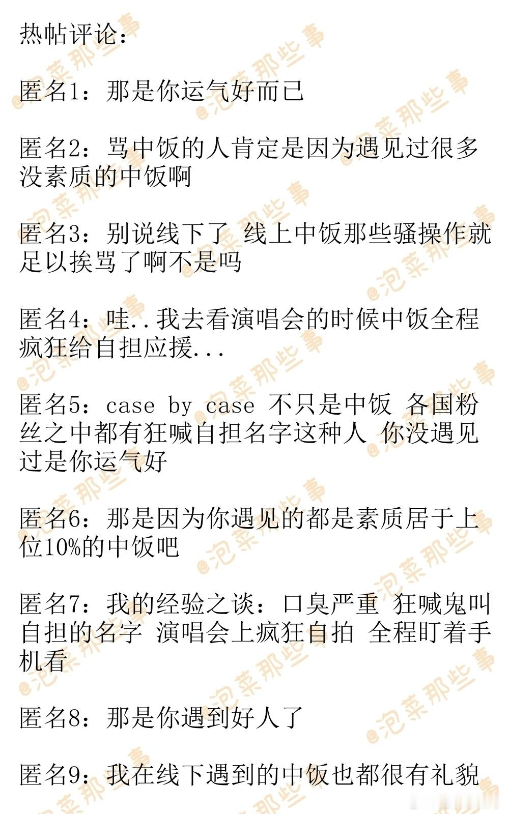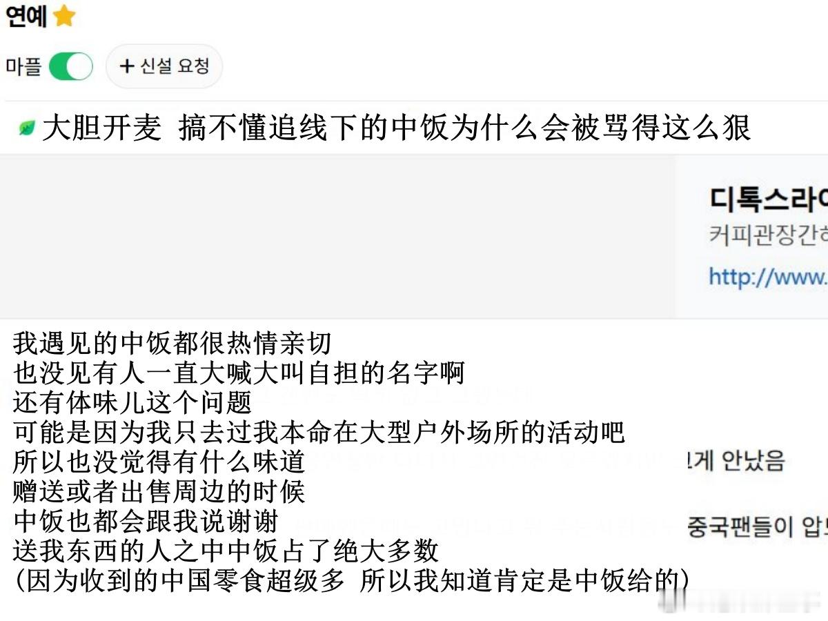 🔥韩网热帖评论翻译🔥搞不懂追线下的中饭为什么会被骂得这么狠韩网原帖帖主称:我遇见的中饭都很热情亲切,也没见有人一直大喊大叫自担的名字啊 还有体味儿这个问题 可能是因为我只去过我本命在大型户外场所的活动吧 所以也没觉得有什么味道 赠送或者出售周边的时候 中饭也都会跟我说谢谢 送我东西的人之中中饭占了绝大多数 (因为收到的中国零食超级多 所以我知道肯定是中饭给的)cr.instiz