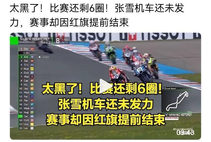 荷兰站第二场,在围剿战术上再加上摔车战术然后中断比赛,然后稀里糊涂让张雪只拿到第7名。西方人都怕成这样了吗?为了阻止张雪,这种下三滥的伎俩都用上了。53号张雪机车车手瓦伦丁·德比斯基本上跑一圈超1位,赛程全部跑完不出意外的话又是前三。但是,那些传统豪强想办法不让你跑。