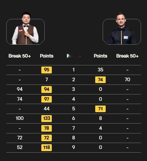 这场比赛,丁俊晖打得很稳,加之运气实在是好,好多球都本来要给对手机会的,又如有神助地跑到没有机会的位置,3-2领先之后连赢4局,最终第一阶段7-2领先,获胜应该问题不大了。