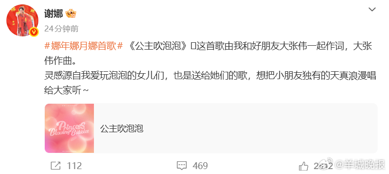 #谢娜公主吹泡泡灵感源自女儿们# 4月19日,分享歌曲《公主吹泡泡》:这首歌由我和好朋友大张伟一起作词,大张伟作曲。灵感源自我爱玩泡泡的女儿们,也是送给她们的歌,想把小朋友独有的天真浪漫唱给大家听~(现代快报)更多消息:#第44届金像奖获奖名单##虞书欣父亲索赔17w败诉##李雨桐被行拘##金像奖影后廖子妤##金莎晒结婚五金##金像奖影帝梁家辉#(编辑:杨雨桐;审签:岑杰昌)