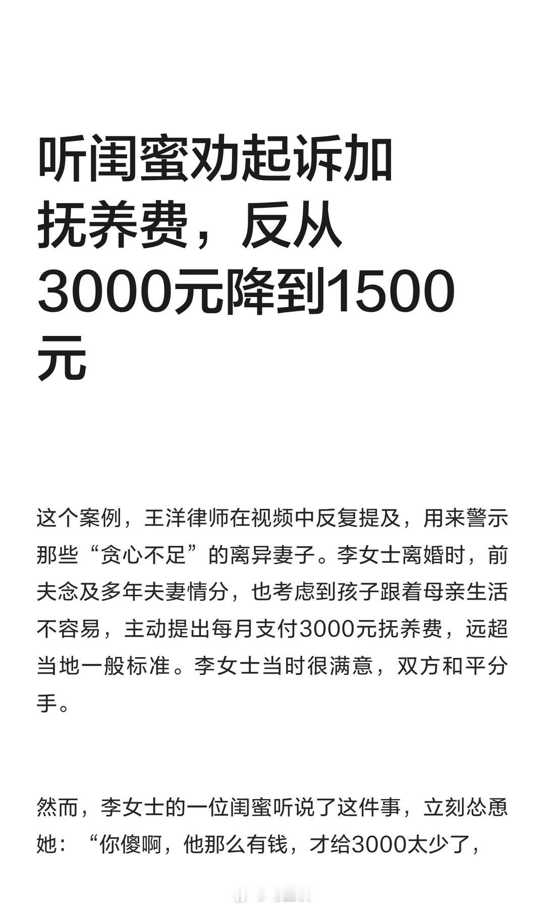 听闺蜜劝起诉加抚养费,反从3000元降到1500…我猜啊,离婚肯定也有这闺蜜的功劳。
