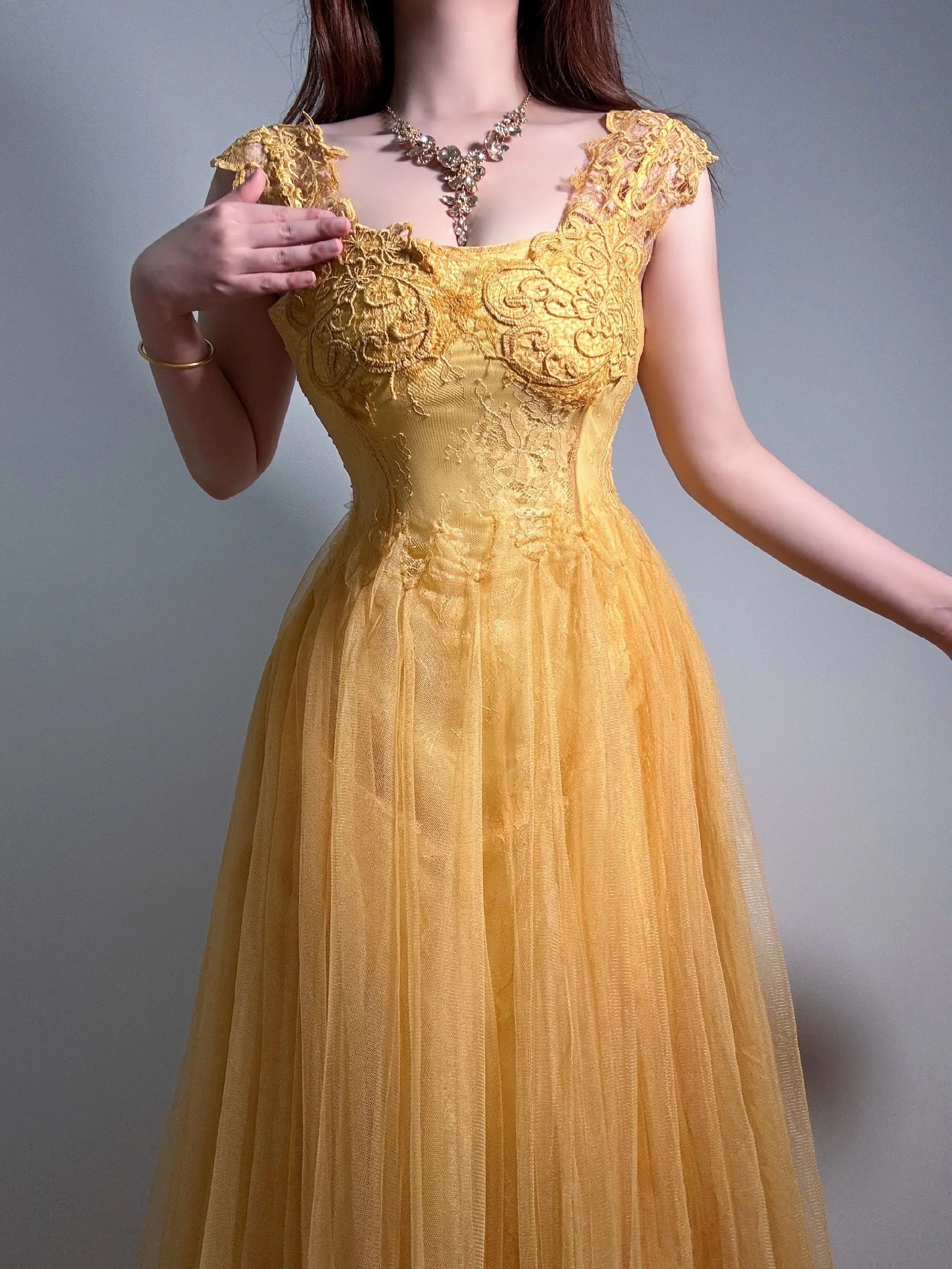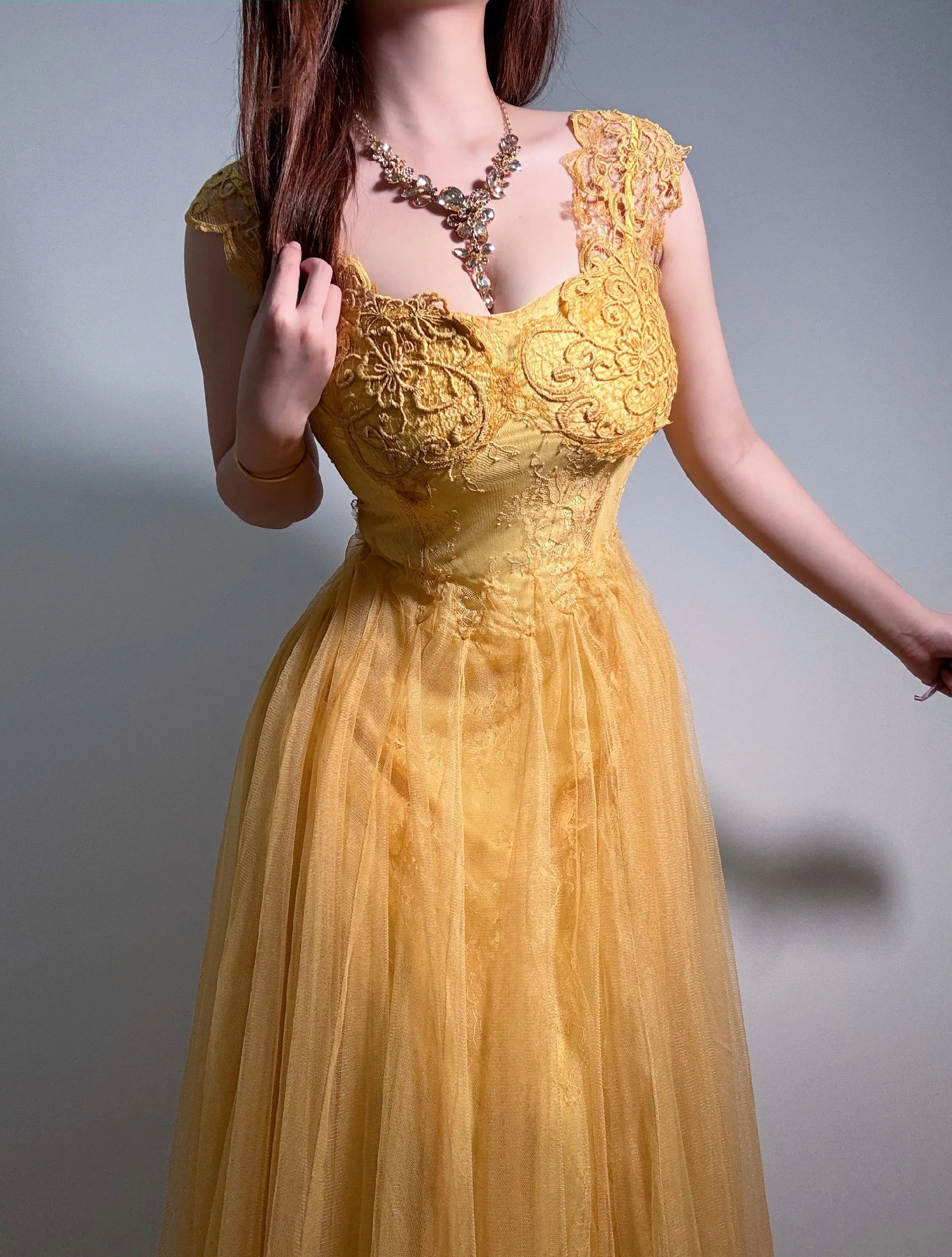 抹胸蕾丝花朵礼服长裙 黄色抹胸礼服裙 黃色纱裙 蓬裙晚礼服 微胖穿搭