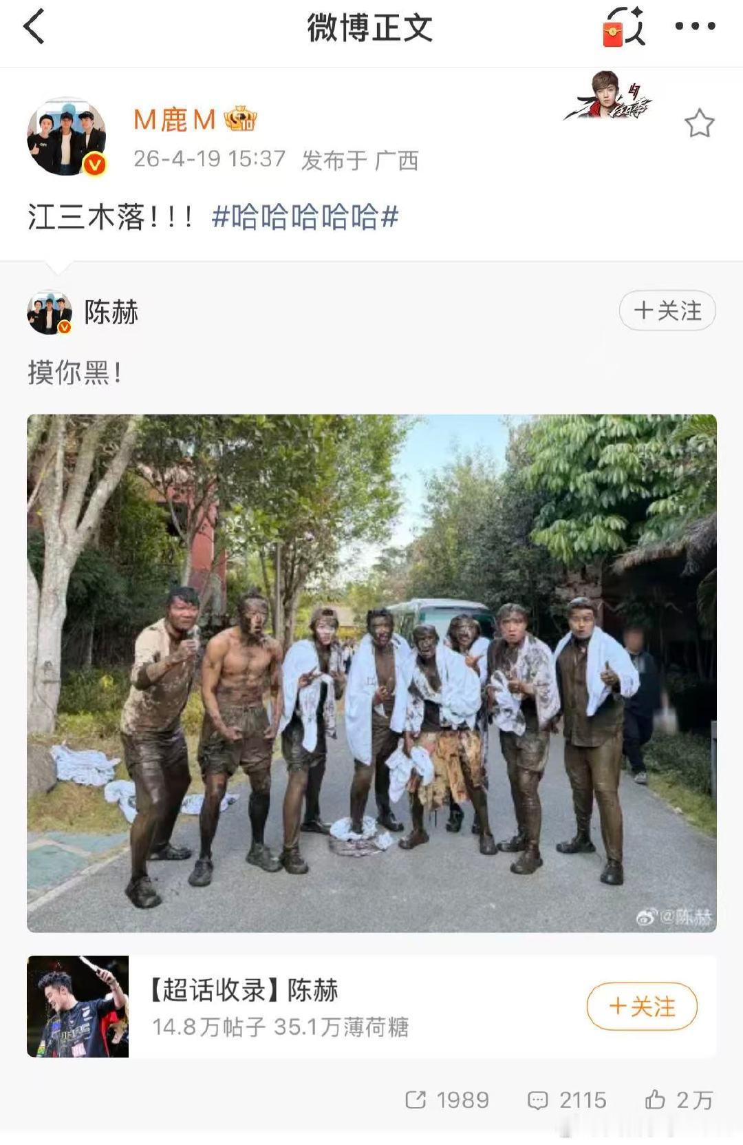 【鹿晗回复陈赫江三木落】4月19日,发文:摸你黑!随后,鹿晗回复:江三木落哈哈哈