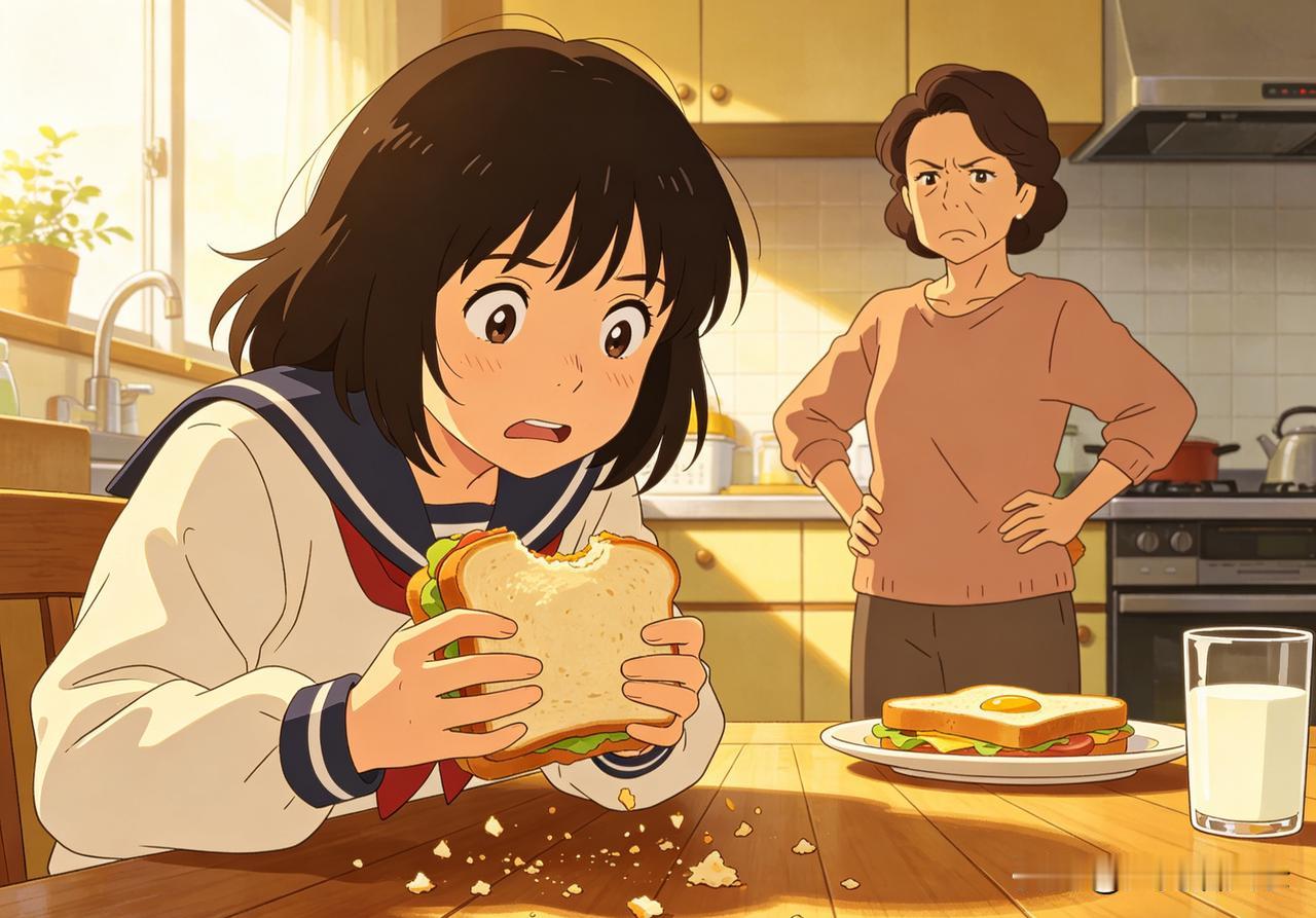 今天早上更离谱,我早起给她做了三明治,她起晚了,我特意叮嘱放微波炉加热,拿的时候端好盘子。结果人家倒好,根本不拿盘子,直接盯着三明治袋子伸手,端出来一晃,整块三明治全撒地上了。转头还气冲冲找我发脾气,说吃不上了干脆不吃,把我气得半天说不出话。