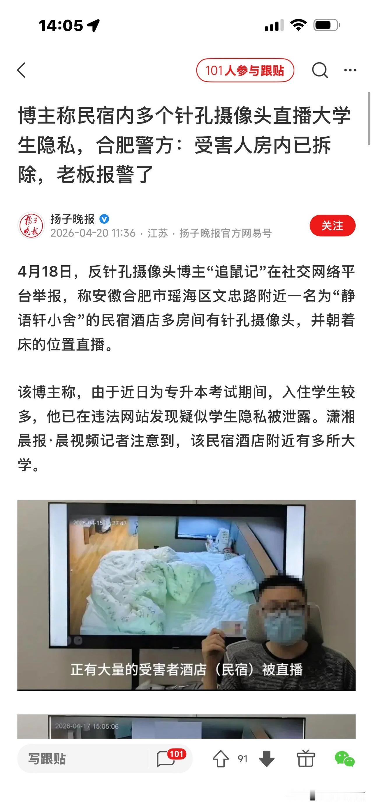 据扬子晚报报道,4月18日,博主“追鼠记”举报,安徽合肥市一家名为“静语轩小舍”的民宿酒店,在房间内装有多个针孔摄像头,朝客人的床位拍摄直播。