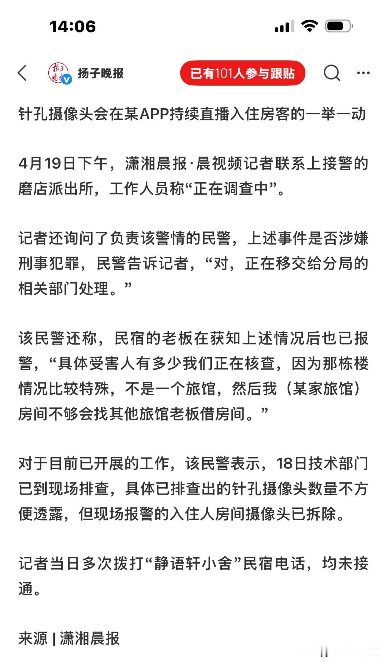 目前帽子叔叔已经确认此事,并告诉记者,正移交分局处理,4月18日已叫人上门拆除偷装的针孔摄像头,针对那些报了警的房间,但数量不太方便向外界透露。