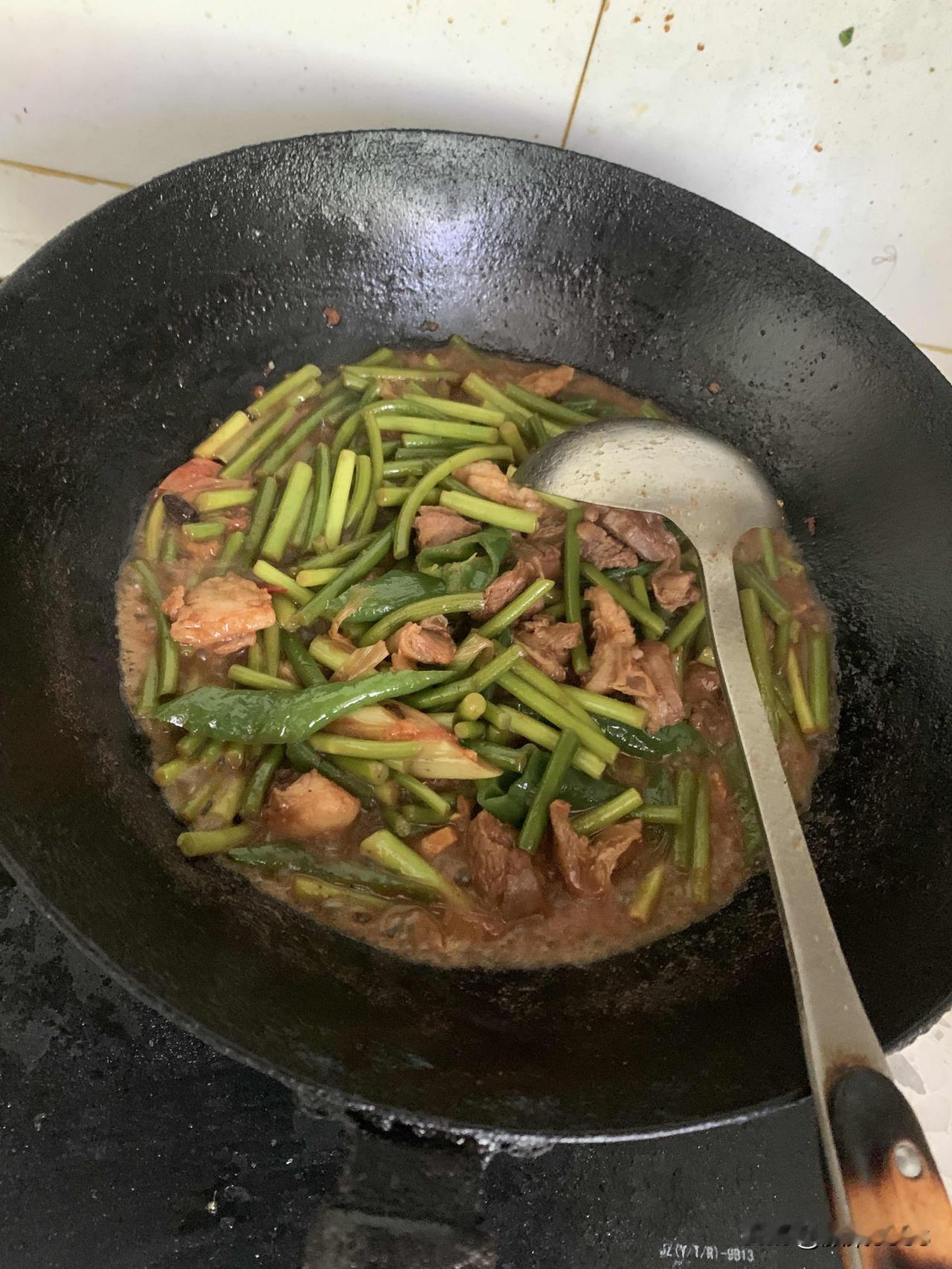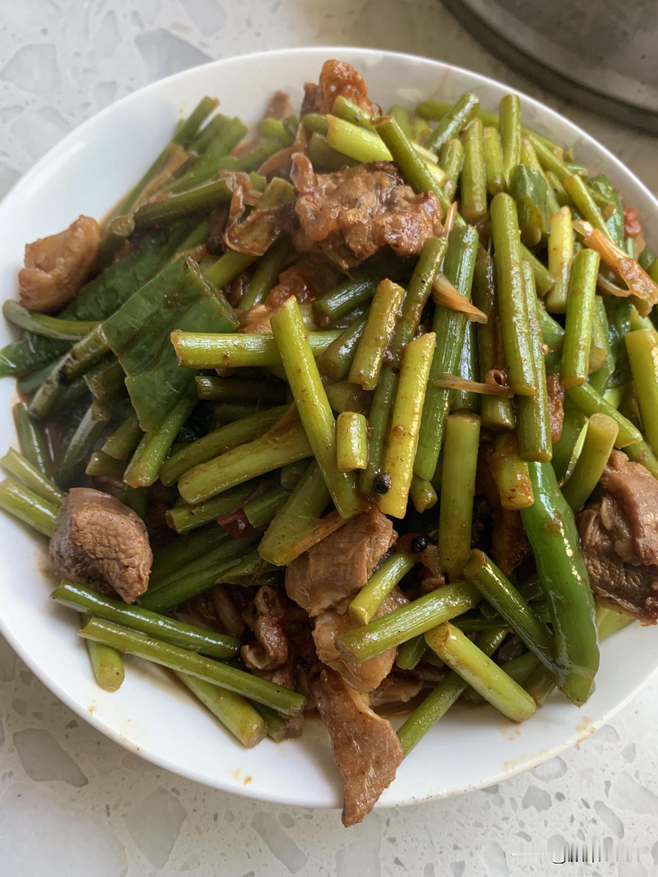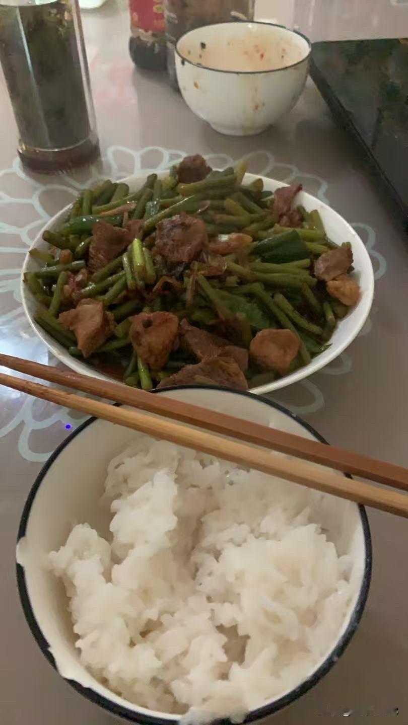 色香味俱全的蒜苔炒羊肉,米饭,一顿简单美味午餐做好了,用时15分钟左右。开造!