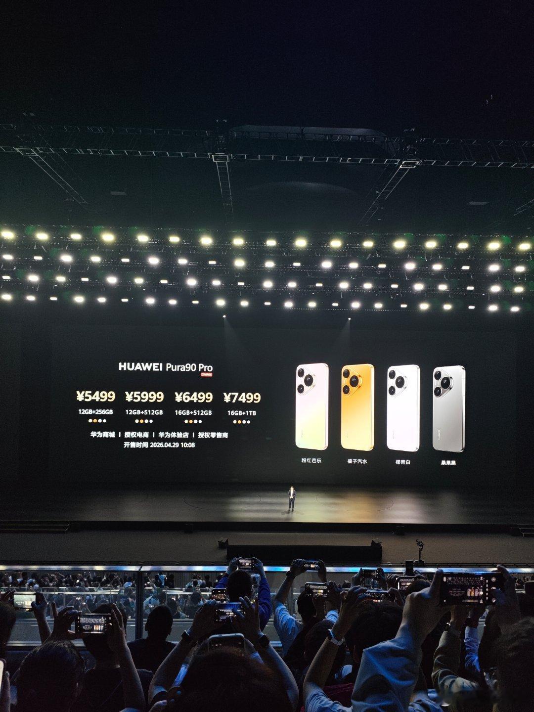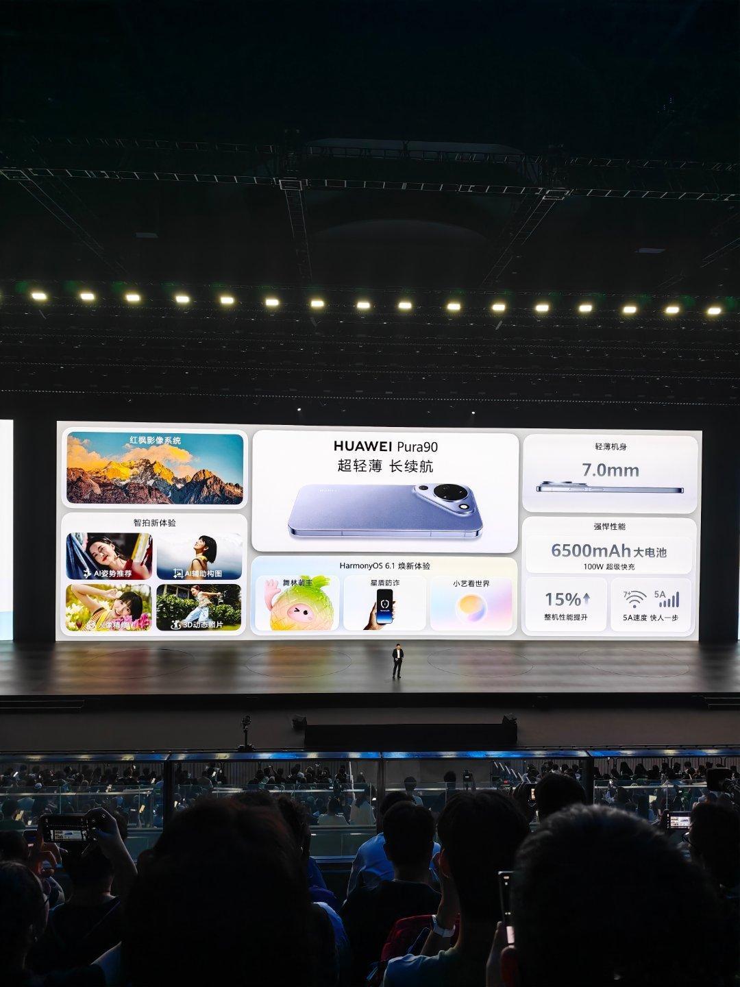 华为Pura 90:6.8英寸直屏,5000万像素前置,5000万f/1.8 OIS RYYB主摄,1250万像素f/2.2 RYYB超广角,5000万像素f/2.2 OIS RYYB 3.7X潜望长焦,前后红枫原色摄像头,6500mAh电池,100W快充,7.0mm厚度,价格4699起。