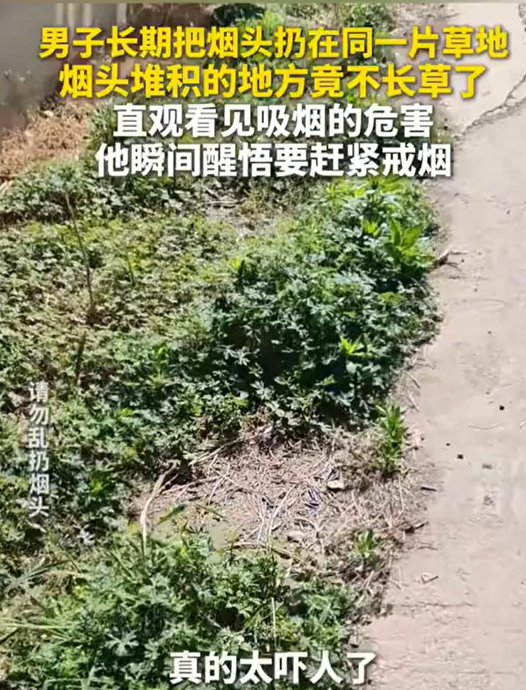 江苏,一男子抽烟后,长期把烟头丢在同一片草地上,这天他又在老地方抽烟时,竟突然发现,自己扔过烟头的草地处竟寸草不生。男子瞬间醒悟,烟的危害太大了,真的要尽快戒烟了!