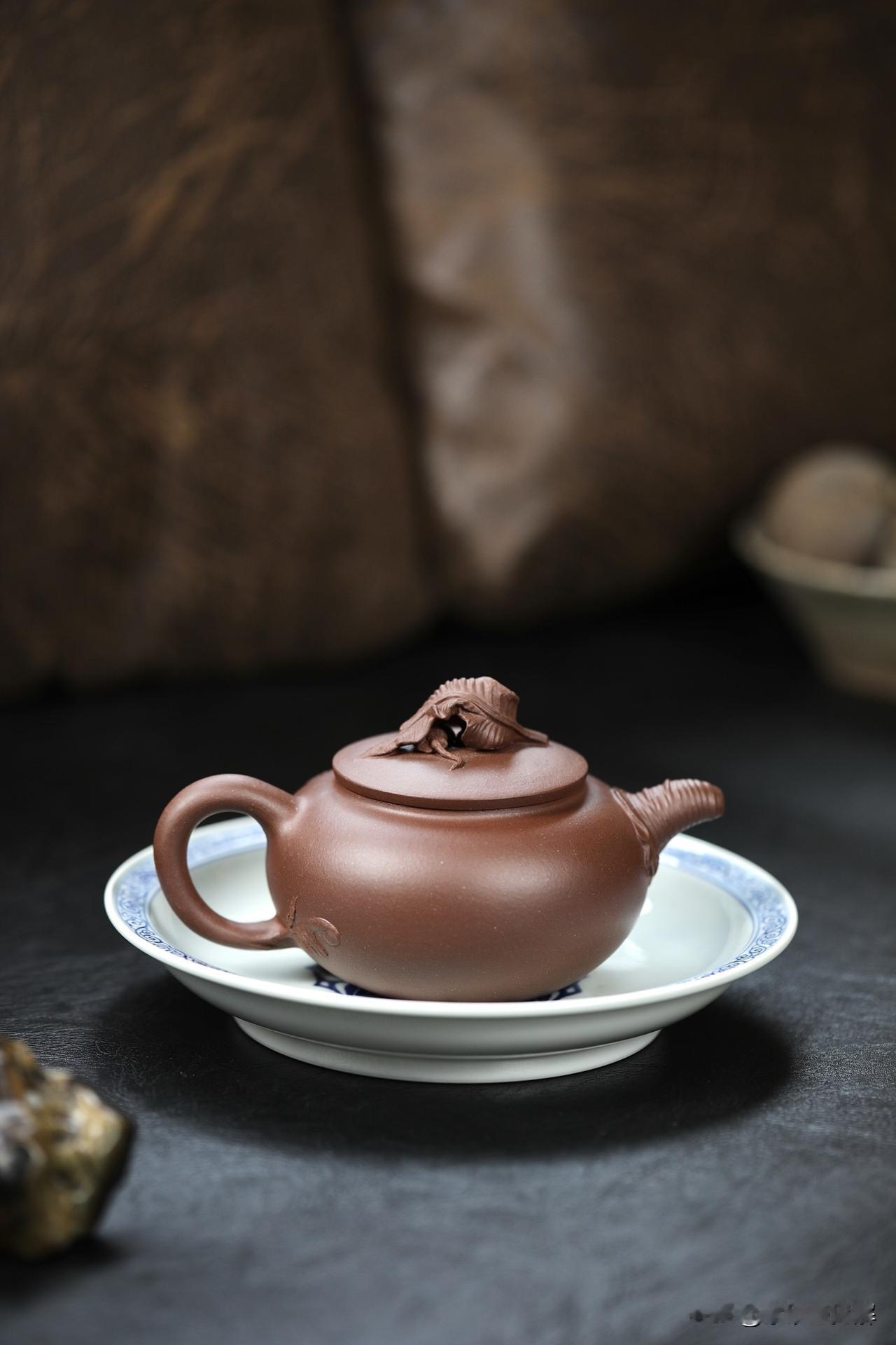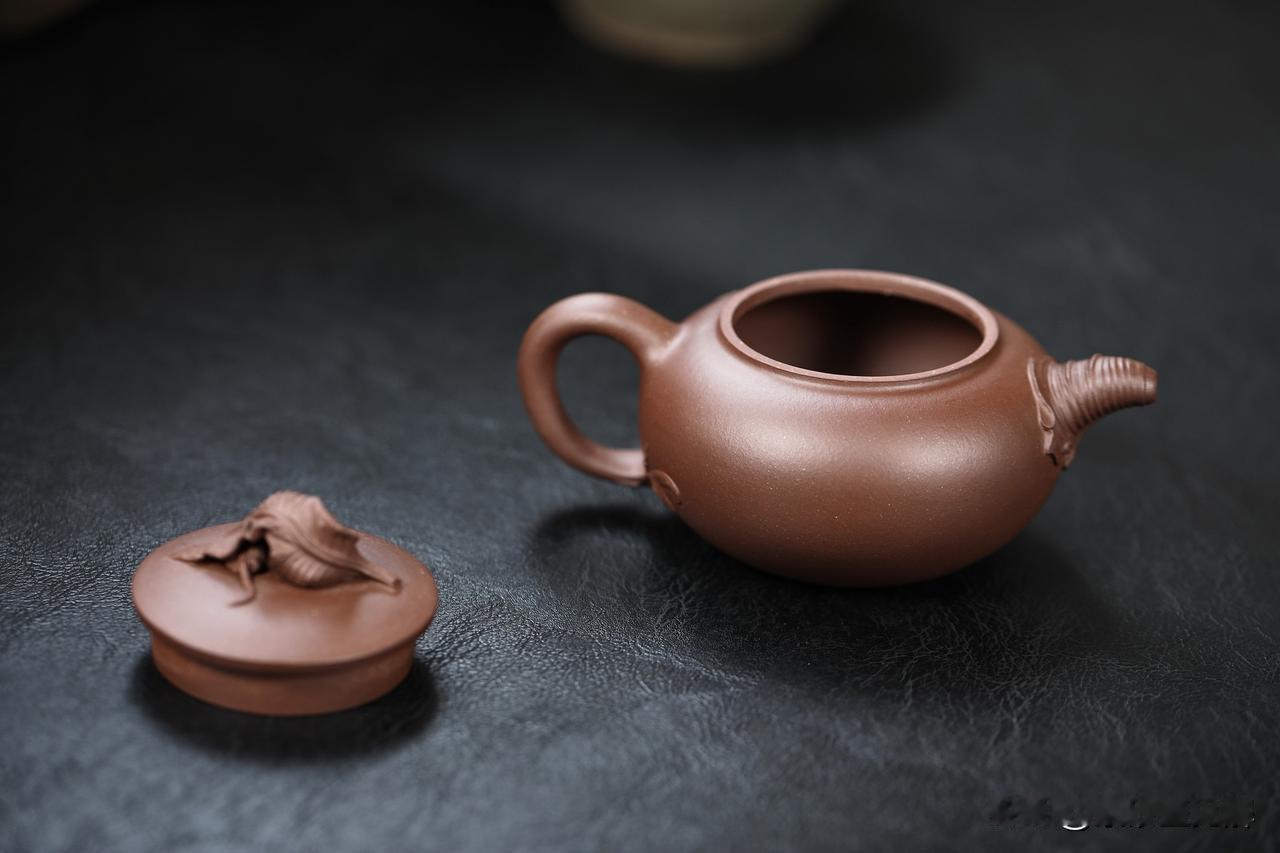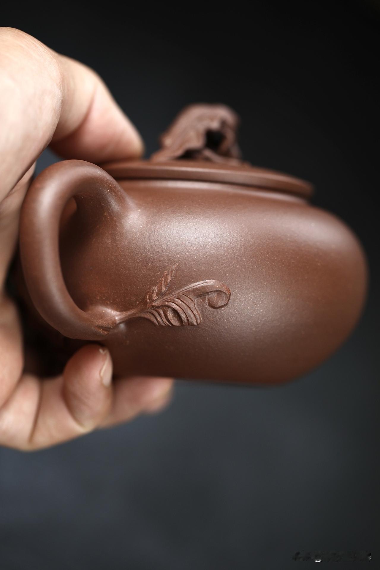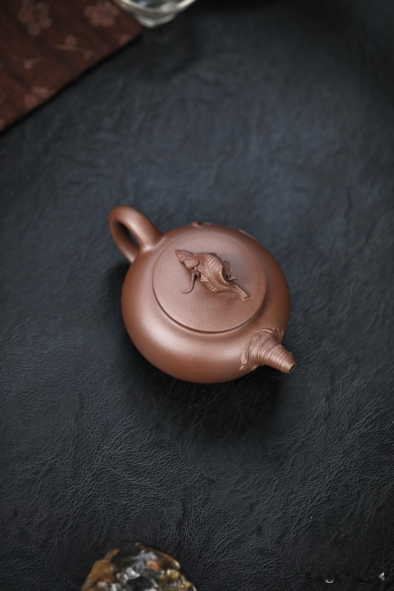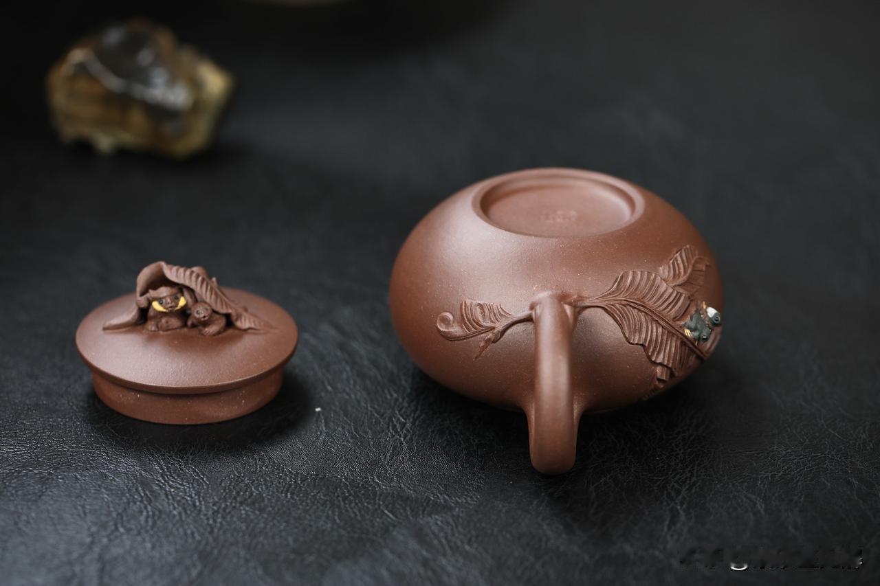 听雨丨摹李涵鸣经典作品 容量270cc丨原矿紫泥 整体轮廓承袭清代汉扁之韵,壶身浑圆,肩部流畅。流、把、钮及壶身装饰皆取法自然,壶钮雕琢拟人猿猴于芭蕉叶下避雨,两猴神态栩栩如生。壶把处芭蕉叶丛生,蜿蜒伸展至壶身,凹凸有致,形态万千。