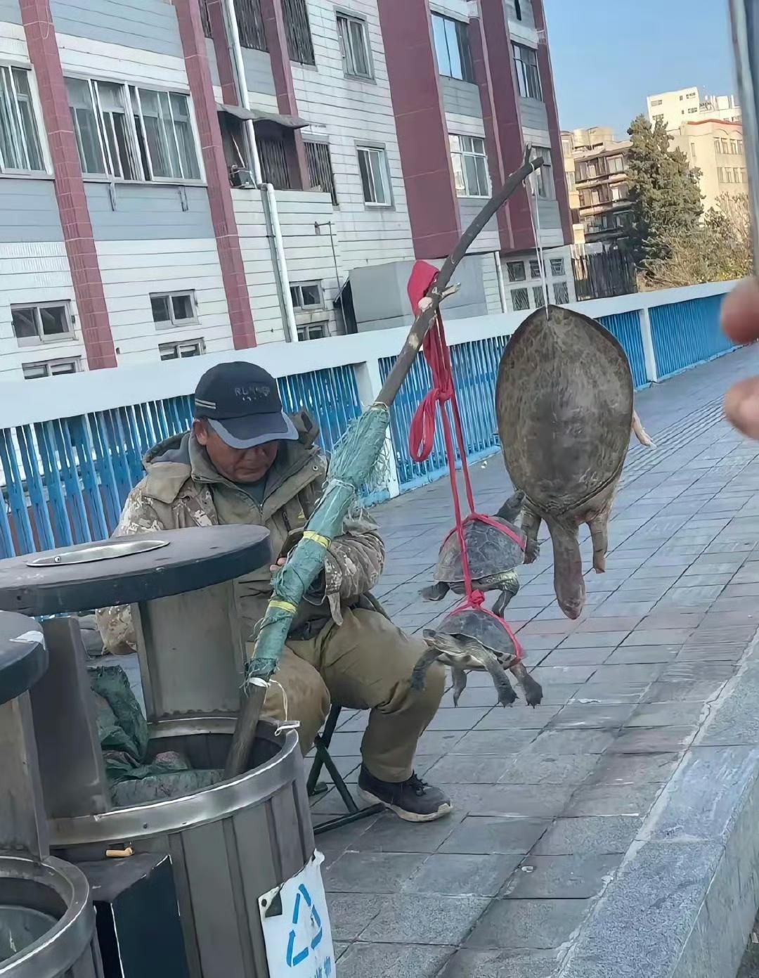 要么是早晚高峰的路口,要么是人流扎堆的天桥下,总能看到他们的身影。没有摊位,没有叫卖,就安安静静站在路边,一身沾着泥点的旧工装,或是洗得发白的迷彩服,手里举一根普通树枝,用红绳拴着几只大小不一的乌龟、王八,就这么从清晨站到天黑,一动不动。