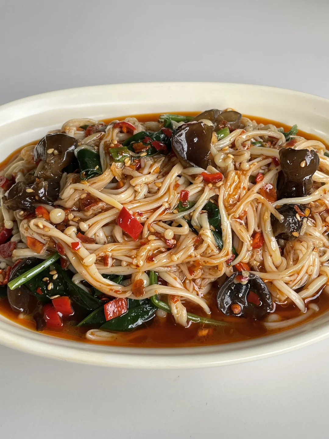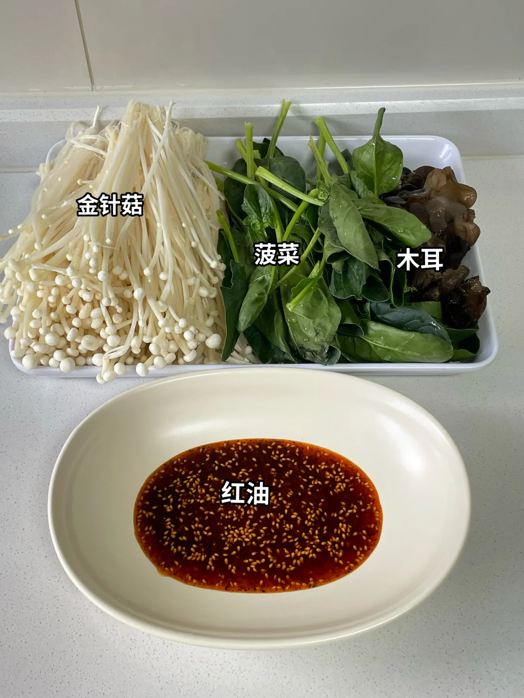 锅中水开,将金针菇、木耳、菠菜按照顺序下锅。煮熟盛出备用。