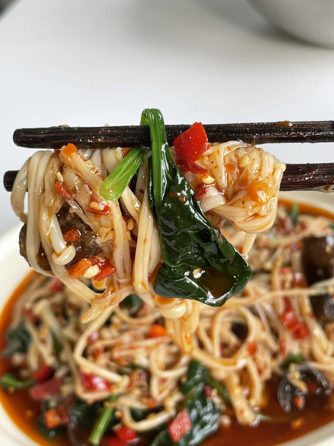 然后浇在捞出的素菜上面拌匀即可,因为我喜欢这种带汁的,所以我水分就没有控的特别干。如果喜欢吃稍微干一点的姐妹们。就可以把素菜的水挤干,然后倒入小料汁,加点芝麻,又是另外一种口感