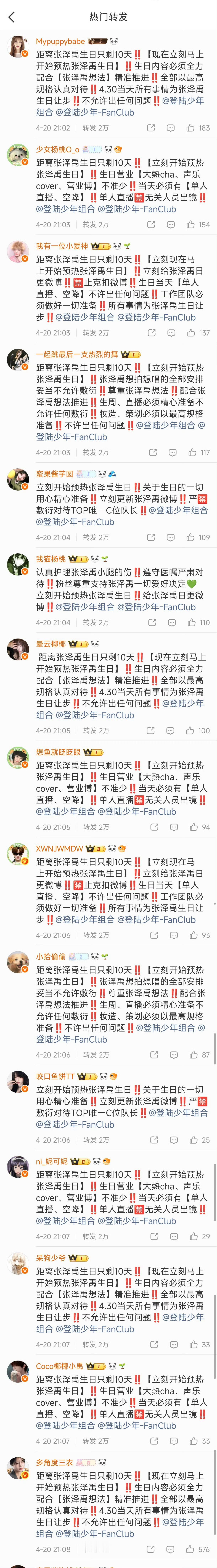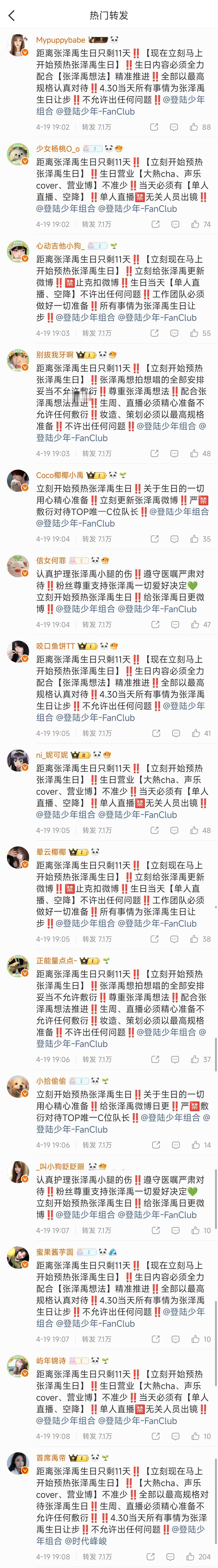 张泽禹粉丝要求生日预热 张泽禹粉丝要求公司对张泽禹生日预热,目前已经把官博转发占了