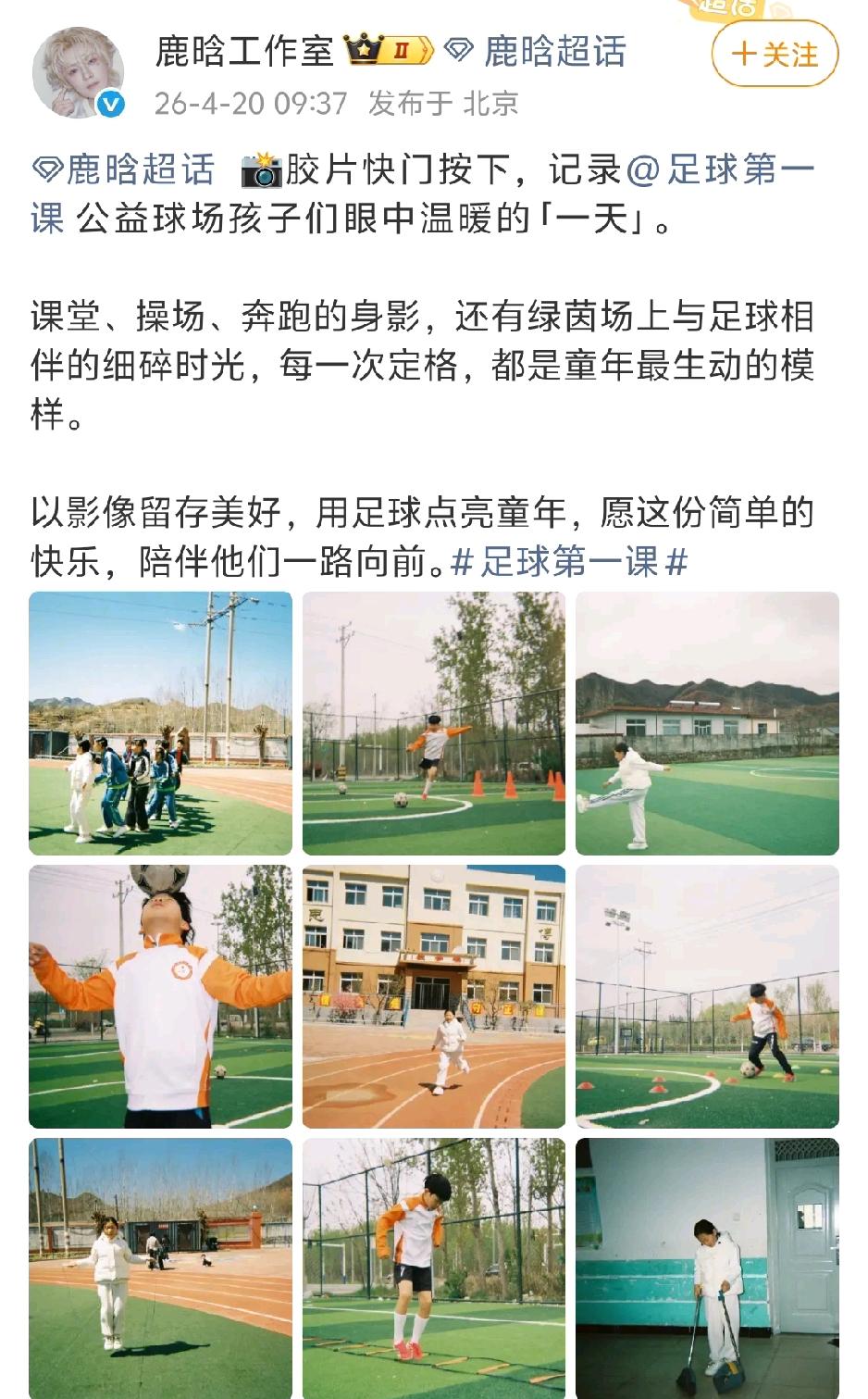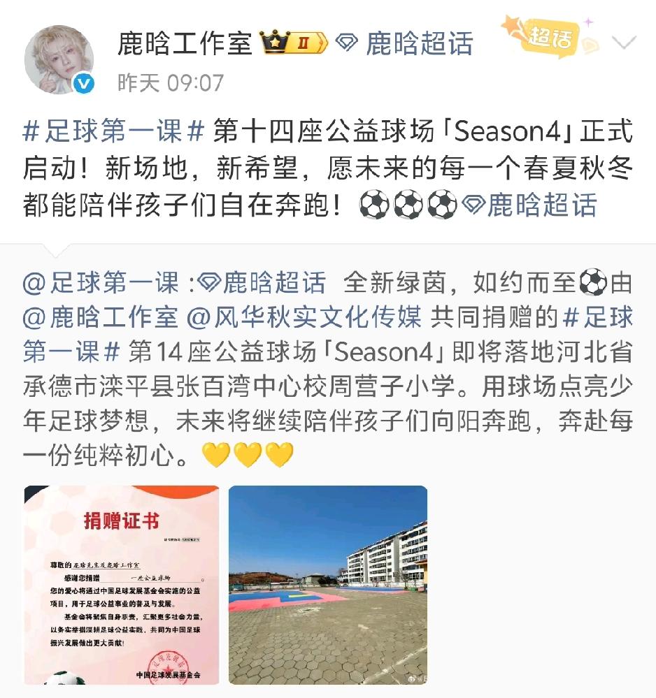 原来鹿晗在今年生日的时候又捐了一个足球场,自2019年起,鹿晗工作室每年4月20日都会发布公益足球场捐赠信息,到今年已经累计计捐建了14座标准化球场,覆盖10余省份偏远山区。