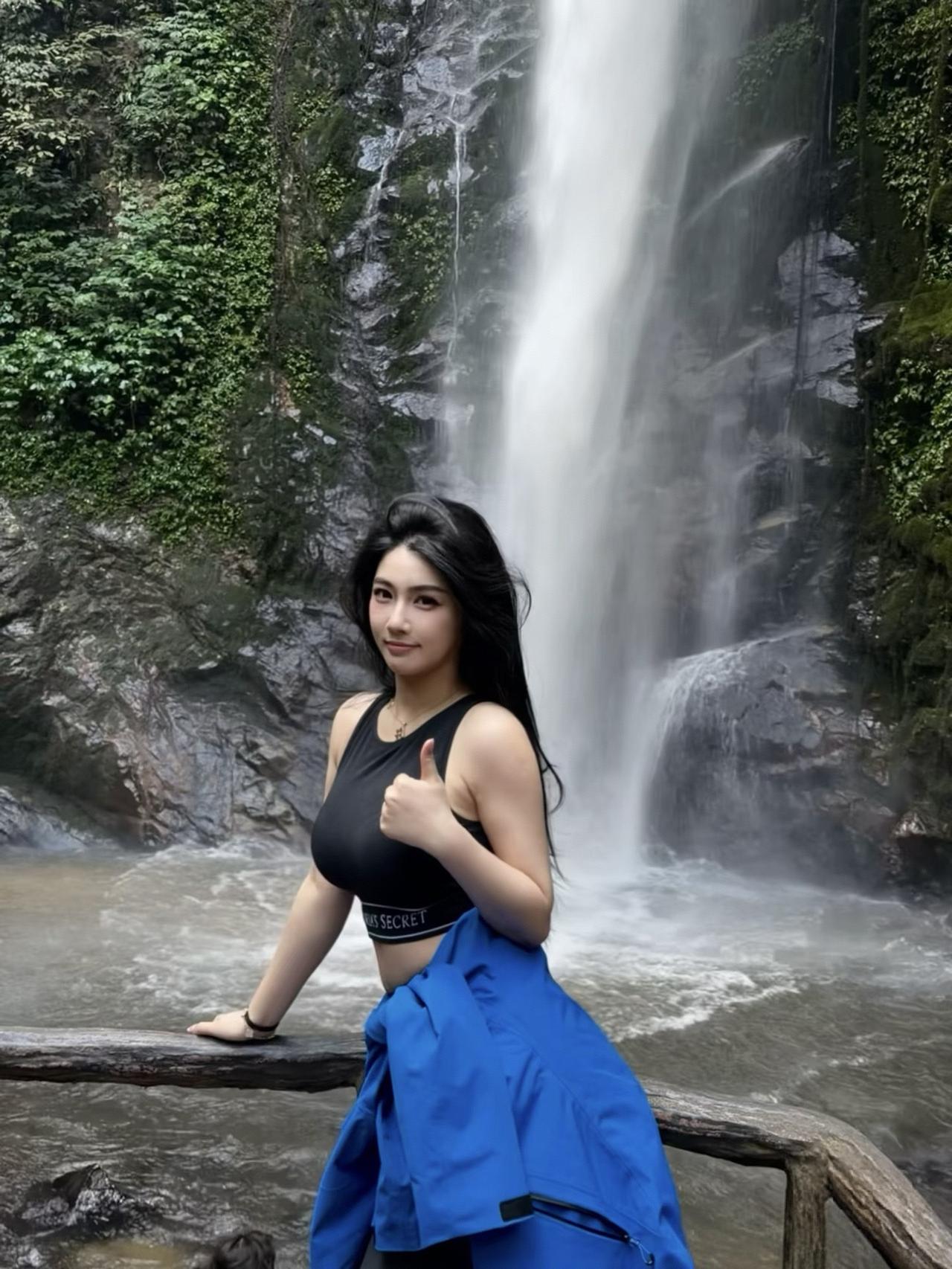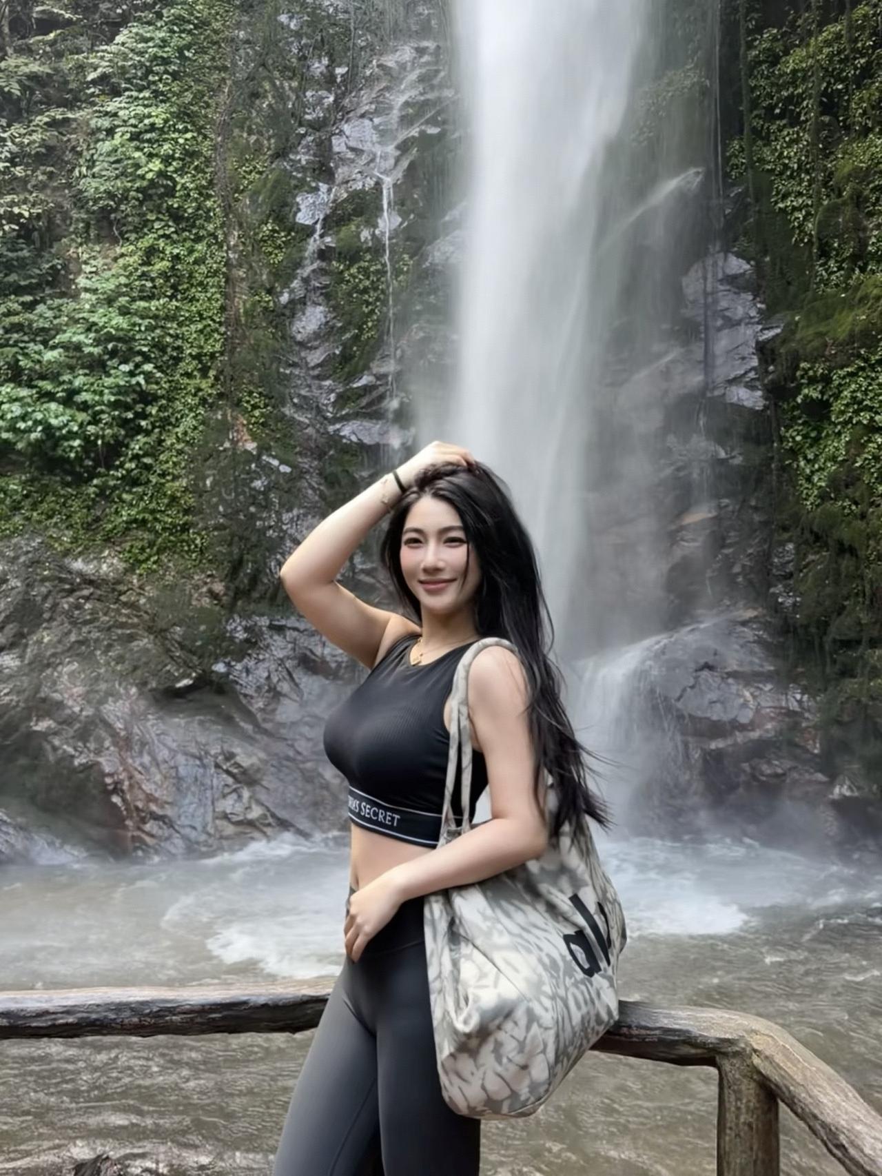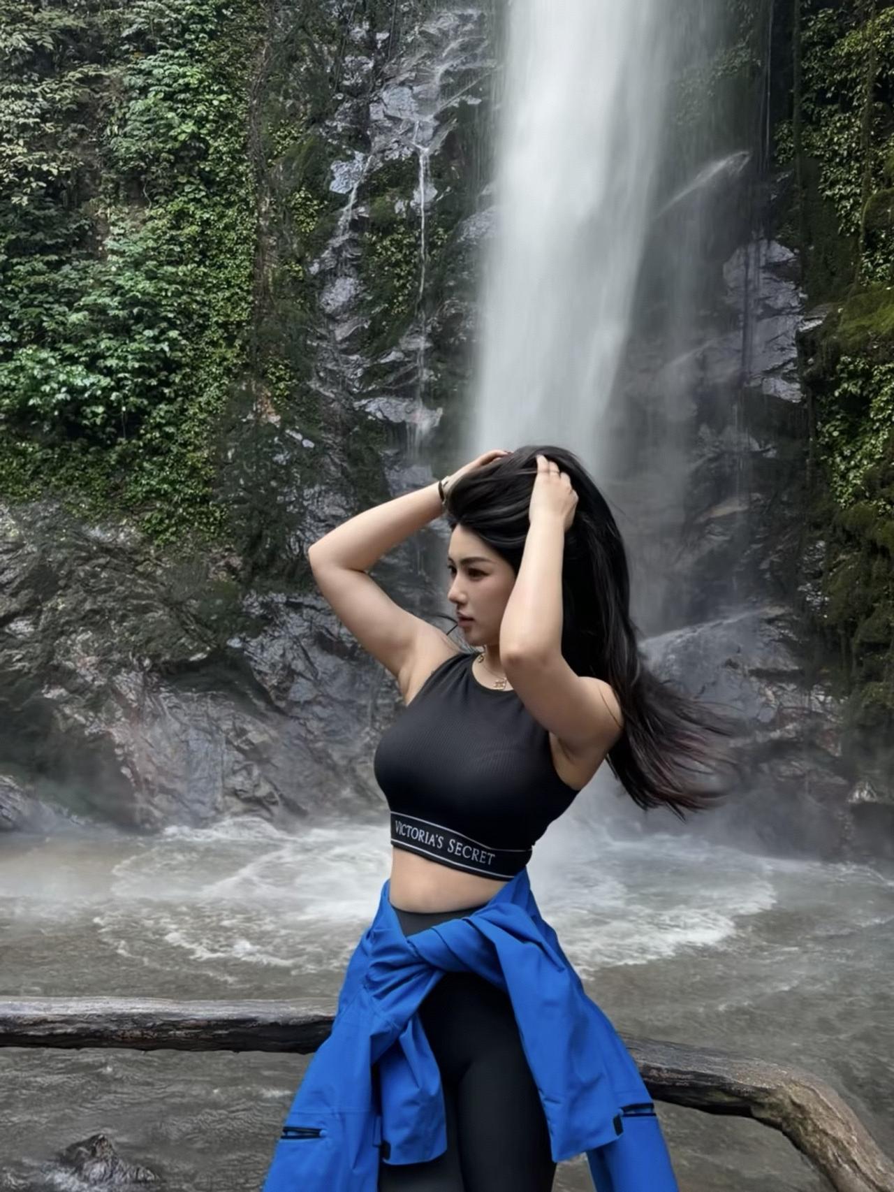 瀑布飞流直下,佳人轻舞飞扬