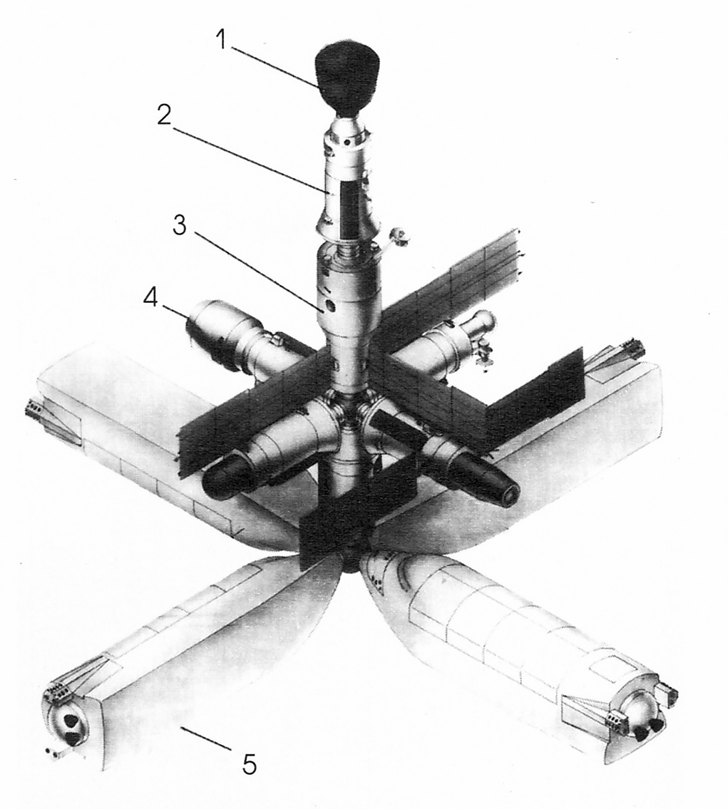 图1.РКК «Энергия»“能源”火箭航天集团在70年代和80年代设计的空间站军事化的版本。基于DOS(礼炮)模块,配备额外的77K(FGB)模块以及由暴风雪号机身建造的战斗航天器;它们将部署弹道武器或较小的轨道轰炸衍生轰炸机。图2.《科技分子》杂志1998年第4期,刊登的基于和平号空间站的军事化版本的宣传画,配备源自暴风雪的轨道轰炸机。
