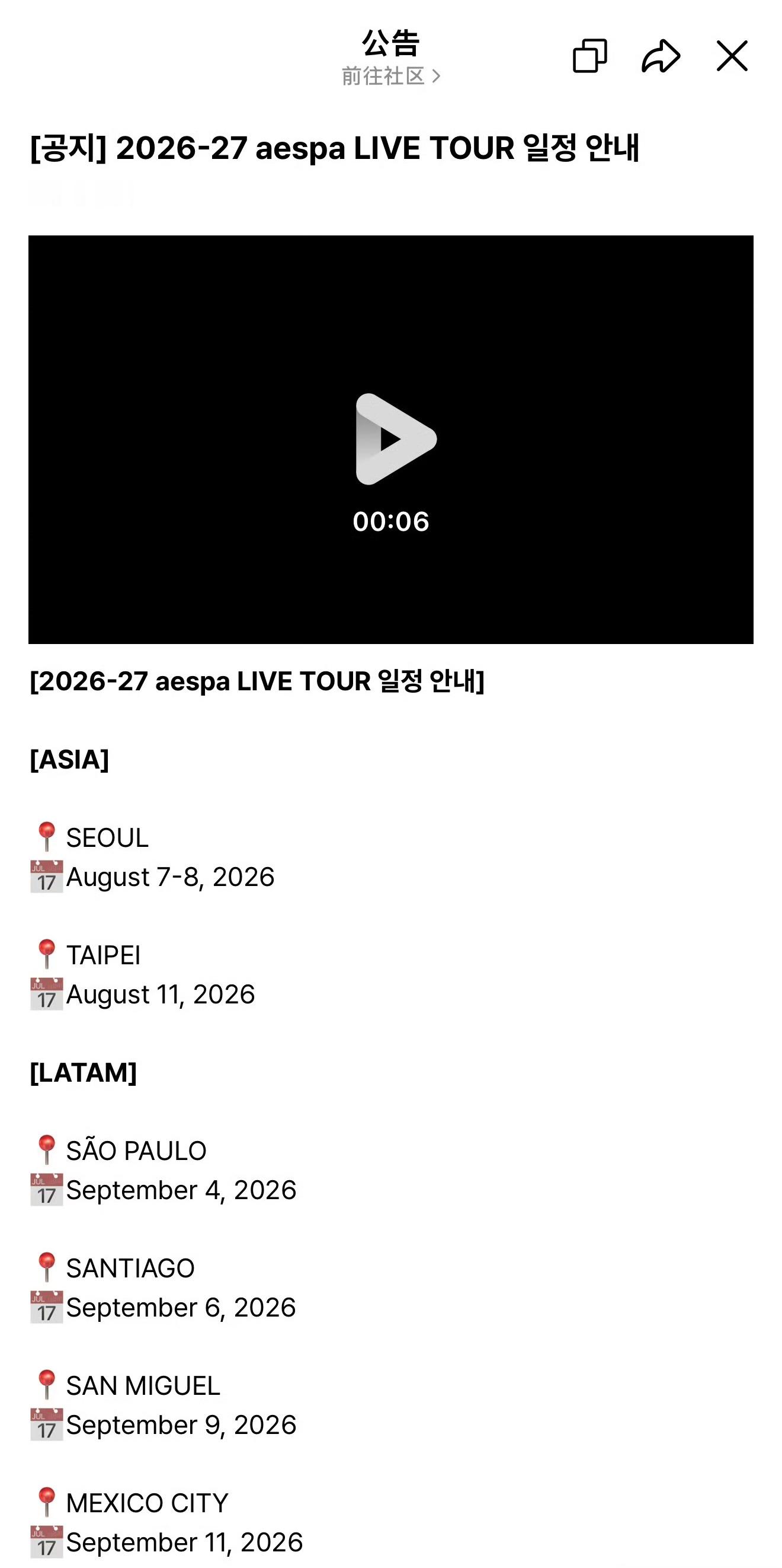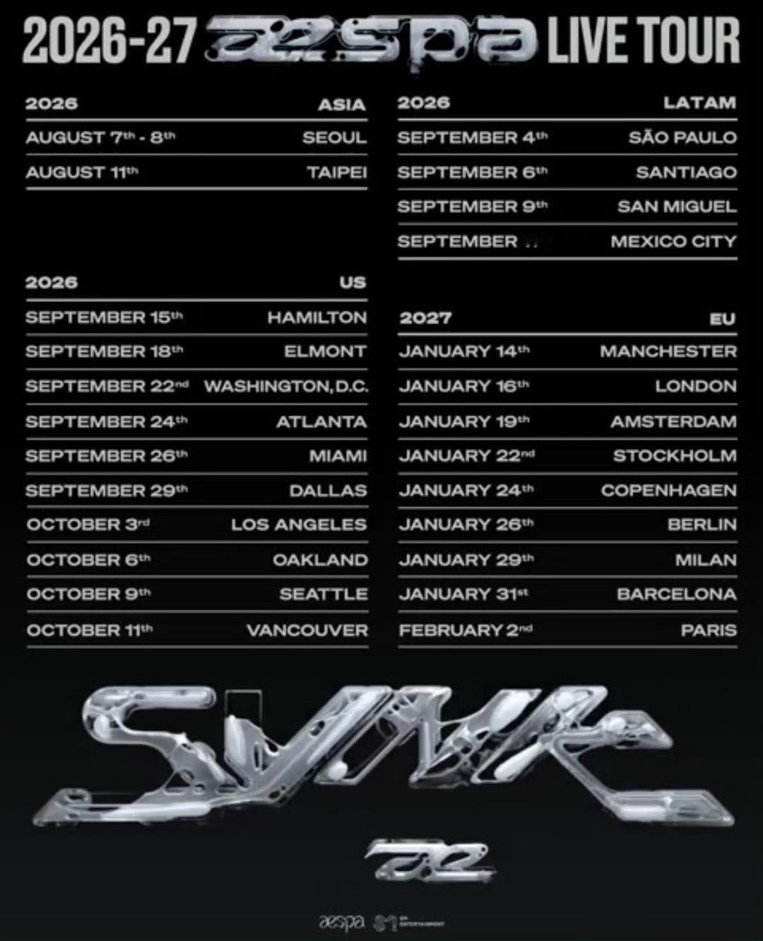 aespa官宣全球巡演 aespa官宣2026-2027全球巡演计划,八月返场首尔、中国台北,欧美巡演至2027年2月🎉