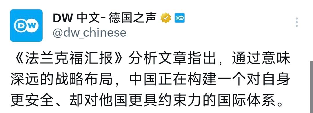 德国之声昨晚(4月20日晚)写道:“《法兰克福汇报》分析文章指出,通过意味深远的战略布局,中国正在构建一个对自身更安全、却对他国更具约束力的国际体系。