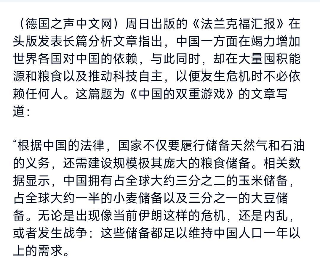 中国一方面在竭力增加世界各国对中国的依赖,与此同时,却在大量囤积能源和粮食以及推动科技自主,以便发生危机时不必依赖任何人。相关数据显示,中国拥有占全球大约三分之二的玉米储备,占全球大约一半的小麦储备以及三分之一的大豆储备。无论是出现像当前伊朗这样的危机,还是内乱,或者发生战争:这些储备都足以维持中国人口一年以上的需求。