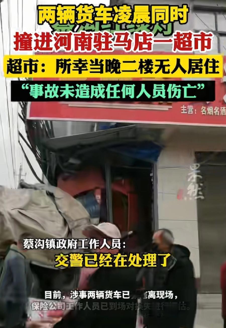 驻马店两辆货车并头撞进一超市,万幸凌晨,二楼也没住人,没有人员伤亡,超市老板笑了