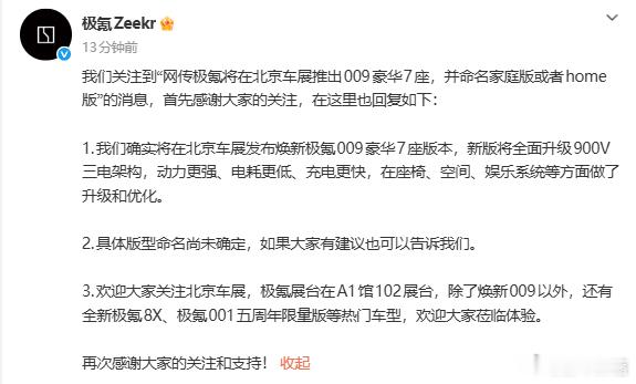 焕新极氪009定档北京车展,4月24日开启预售,看完配置只能说诚意很足全栈900V高压架构、720km续航,解决了很多人关心的续航与补能问题。内饰重点升级二排体验,零重力+旋转座椅+高配音响,家用商务都很能打。底盘和智驾部分更是直接拉满,AI数字底盘、高阶空悬减振、高算力智驾芯片,完全是百万级配置下放。作为常年霸榜40万以上MPV的车型,这次升级不是小改款,而是全面补强,看得出极氪想把高端MPV市场彻底攥在手里,中国品牌这次是真的硬气焕新极氪009定档北京车展预售
