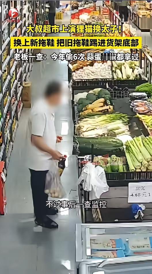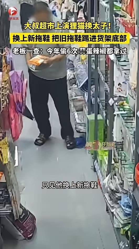 信息来源:《大叔超市上演狸猫换太子 !换上新拖鞋 把旧拖鞋踢进货架底部,老板一查:今年偷6次 蒜蛋辣椒都拿过》AHTV第一时间