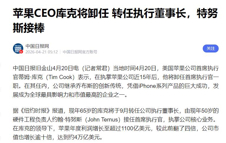 当地时间4月20日,管苹果快15年的CEO蒂姆·库克,正式说要卸任了。大家别瞎猜,不是被开除,也不是出啥意外,就是正常换岗。