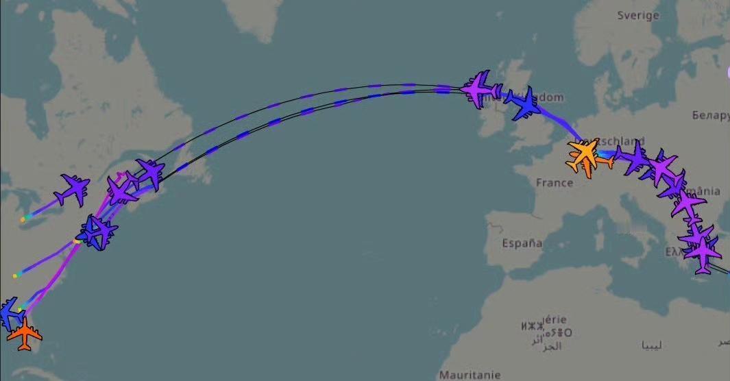 美军运输机从欧洲出发,穿越地中海区域,目的地靠近以色列、约旦等中东国家。以下是过去几个小时的情况: