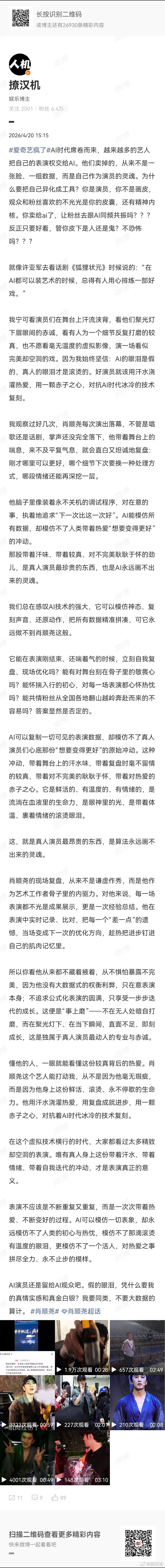 因为观众怕演员变成AI——那会让自己的一腔真情,显得可笑又可悲。因为演员怕观众变成AI——那会让自己的一腔热爱,显得孤独又徒劳。
