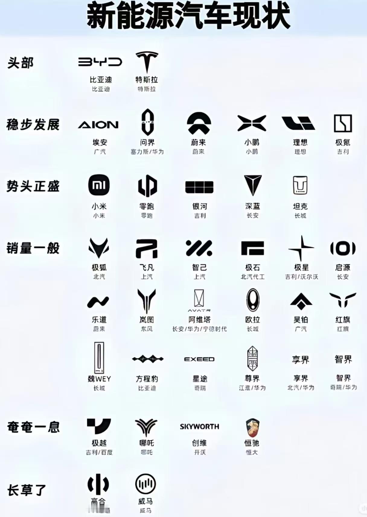 靠后的有好多车标,貌似在路面上就没见过,估计再过多几年就不行了。反观前三行,无论是讨论度、热度和出现率都非常高。其中最值得注意的就是零跑了。
