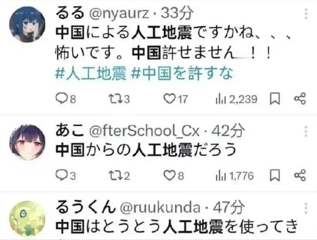 看到最搞笑的一条评论说:“中国要是真有能随便制造7级以上大地震的技术,早就把日本列岛摇散黄了,还用等到今天?”这话虽然糙,但理一点都不糙。