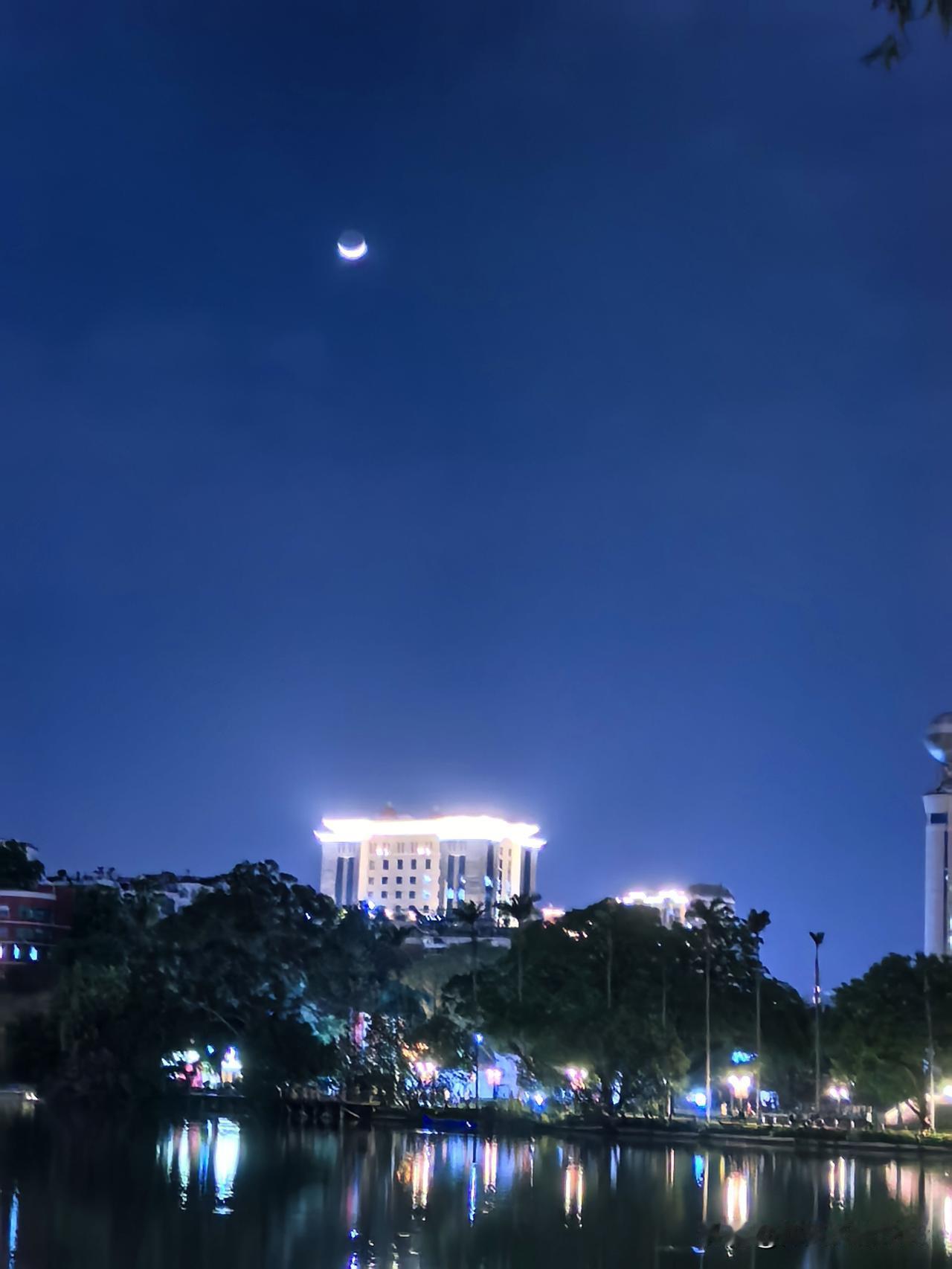 夜晚散步时,漫步于西湖公园的林荫道上,我深深沉醉于这迷人夜色!一弯弦月悬于蔚蓝色的天空,身旁白云似絮,宛如缠绕在树梢,为这夜空增添了几分温柔。微风轻拂,湖面泛起粼粼波光,更显优雅。
