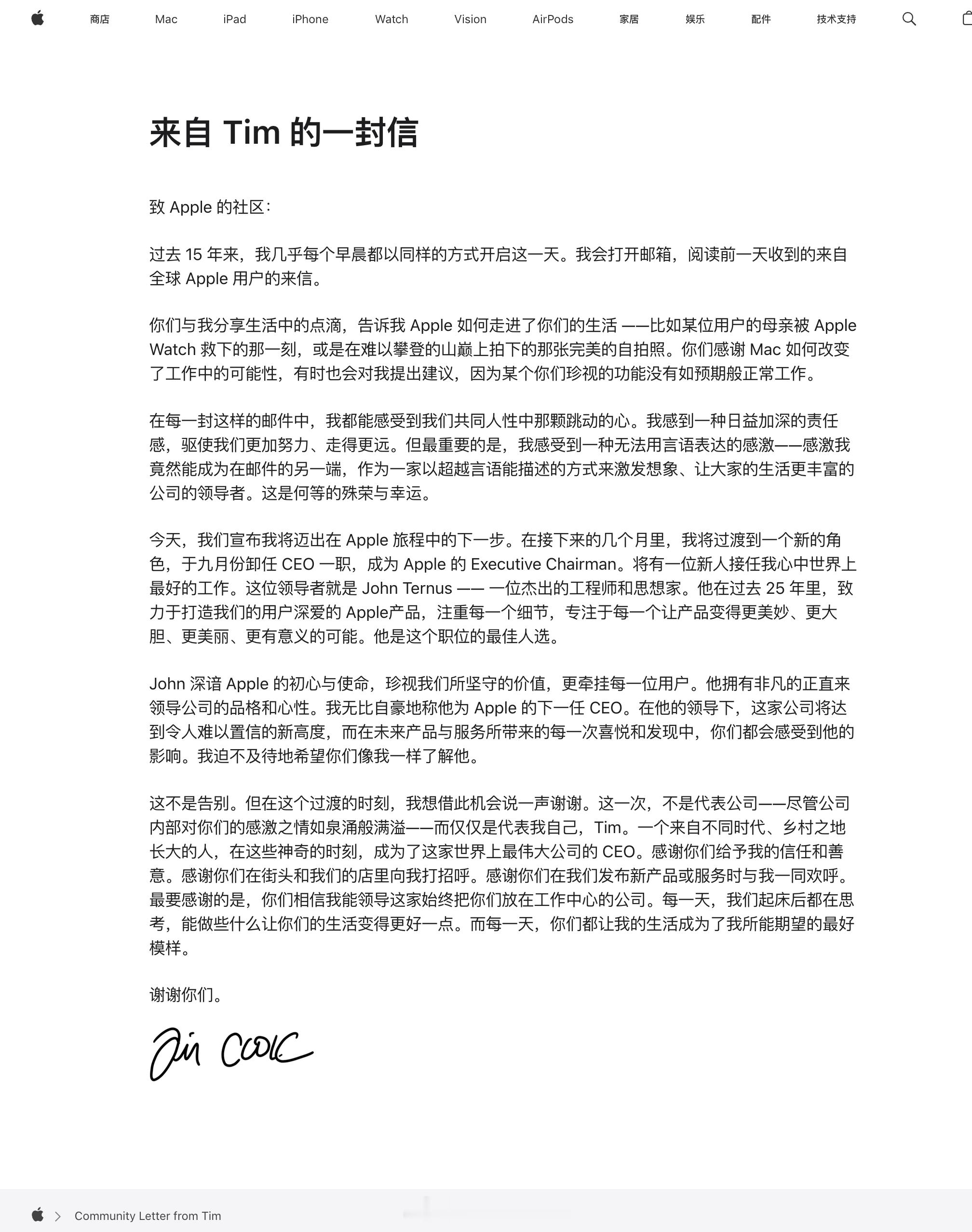 今天,苹果官网首页刷新了「来自 Tim 的一封信」,官宣库克不再担任苹果CEO。
