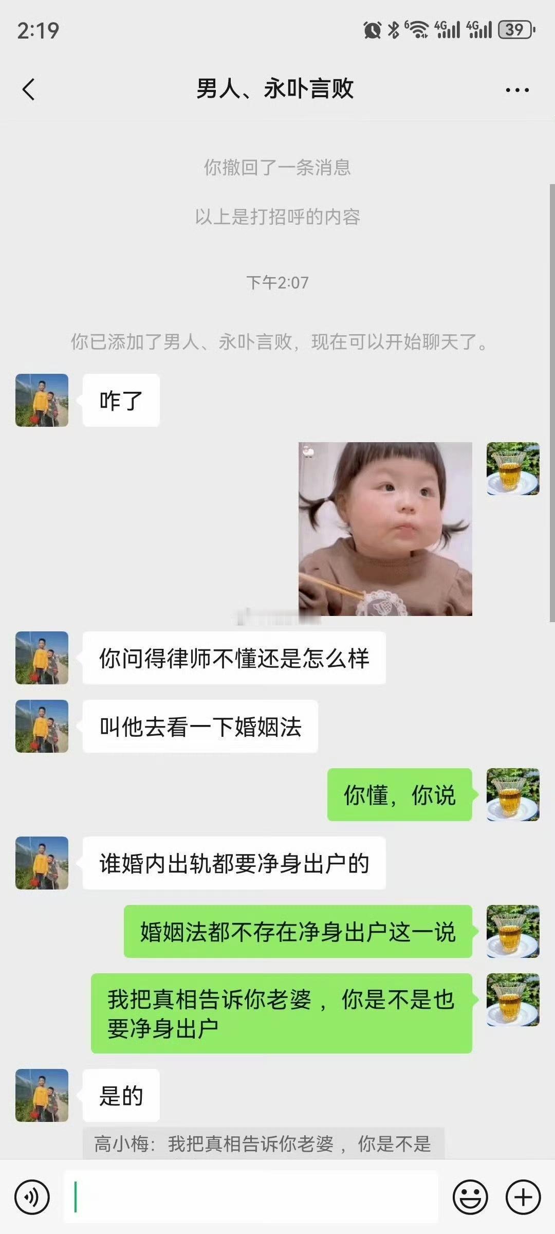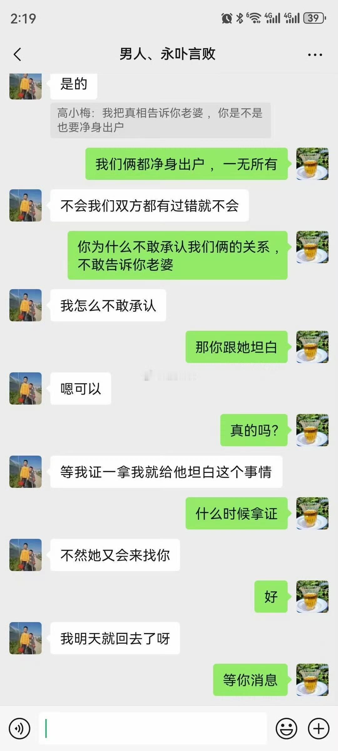 女子曝光老公和小三的聊天记录,之前就警告小三不要招惹了她老公,没想到她却换号了,偷偷的和她老公联系。小三 38 岁,和她老公是生意合作伙伴,没想到就合到一块去了。这个原配被逼的没办法,可能也警告过她老公,没想到却没什么效果,老公舍不得小三,小三也舍不得老公,两人都是有家庭的,却又舍不得家庭双宿双飞,就这样偷偷的在一起。看了下出轨的责任,其实大部分时候都在男方。男的不去撩,女的也不会冲破防线,作为女人第一还是要看好自己的老公。