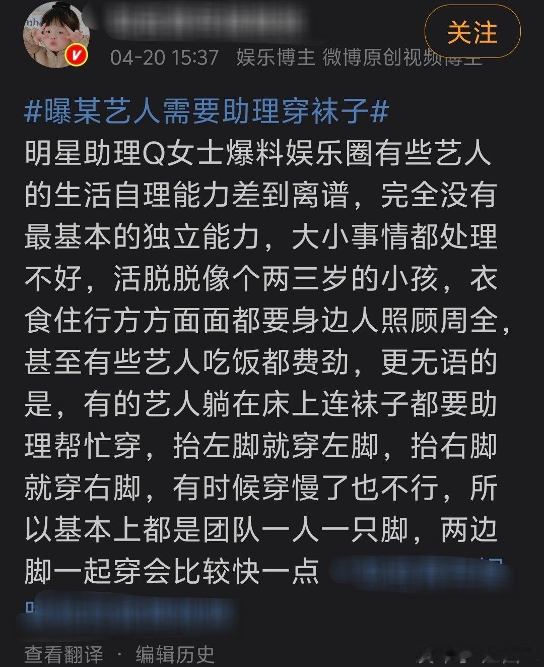 曝某艺人需要助理穿袜子 明星助理称有艺人生活自理能力差到离谱,大小事都做不好,像个两三岁的孩子,袜子都要自己穿,这说的谁啊