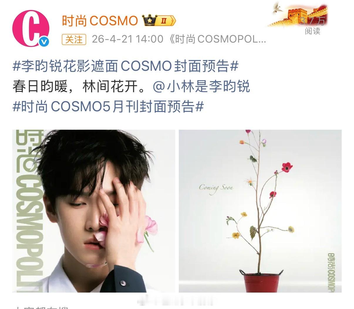 李昀锐登COSMO五月刊封面,花儿与少年,青春气息扑面而来