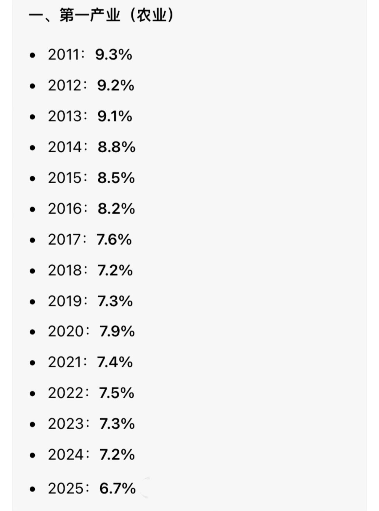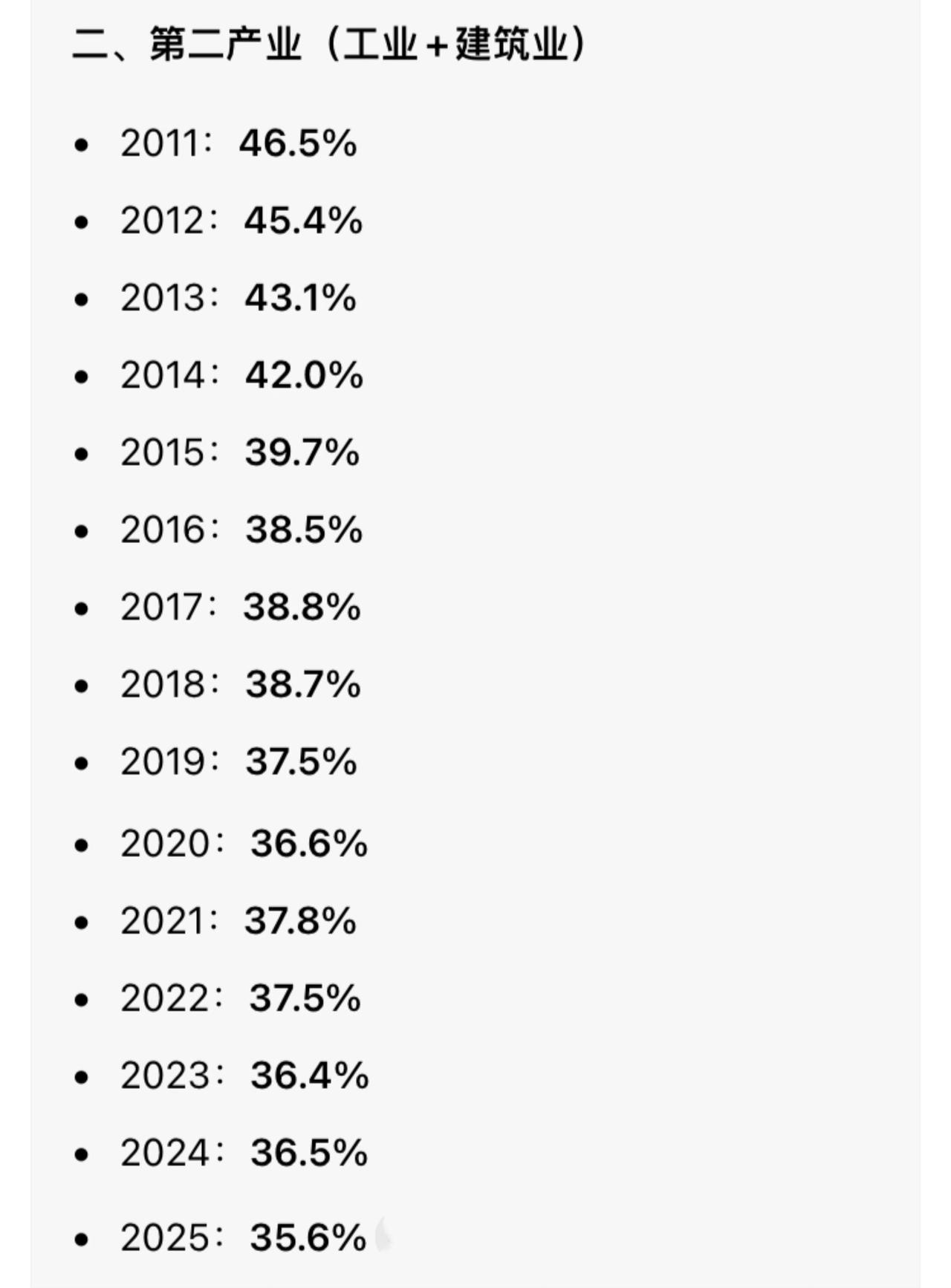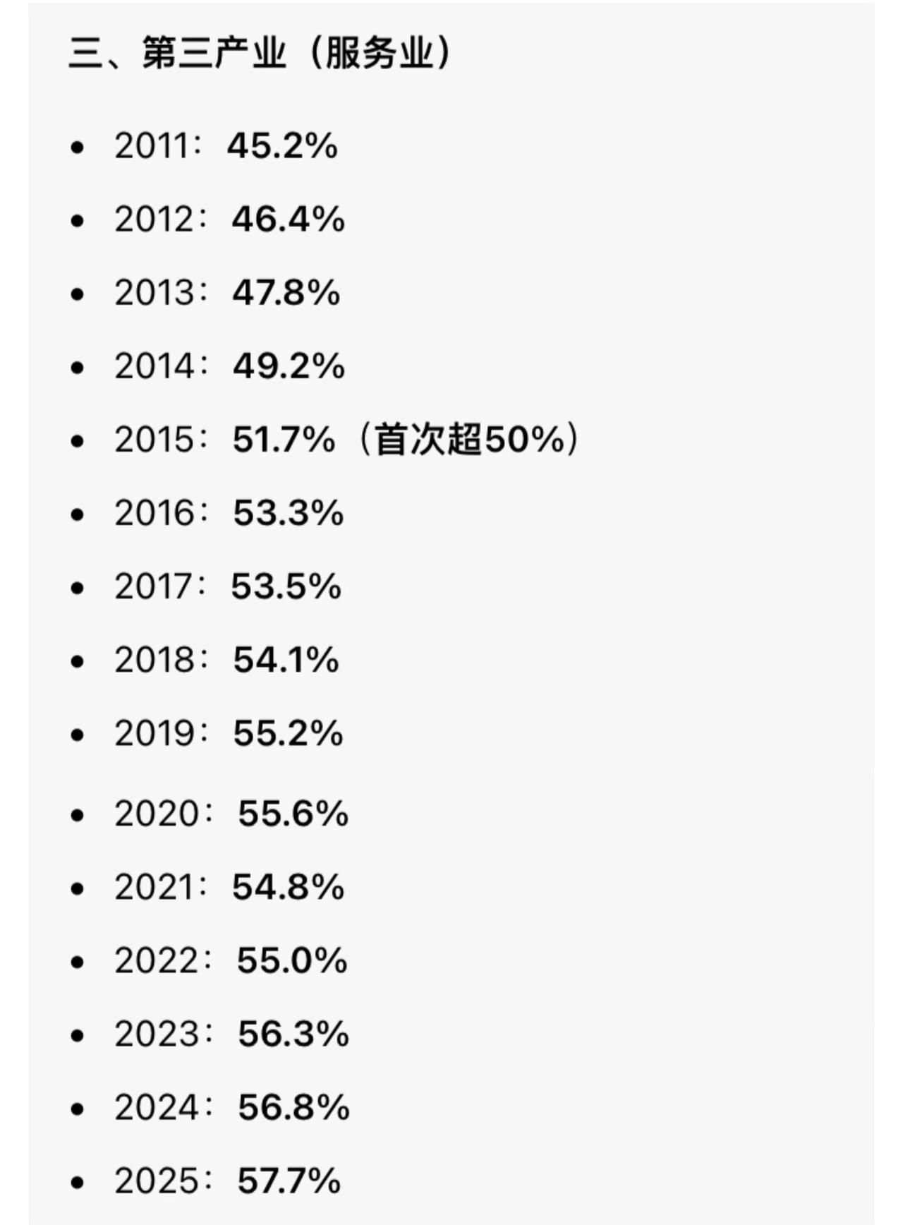 农业从15年前占比9.3%下降到6.7%;工业从15年前GDP占比46.5%下降到35.6%;服务业从15年前GDP的45.2%上涨到现在的57.7% 。
