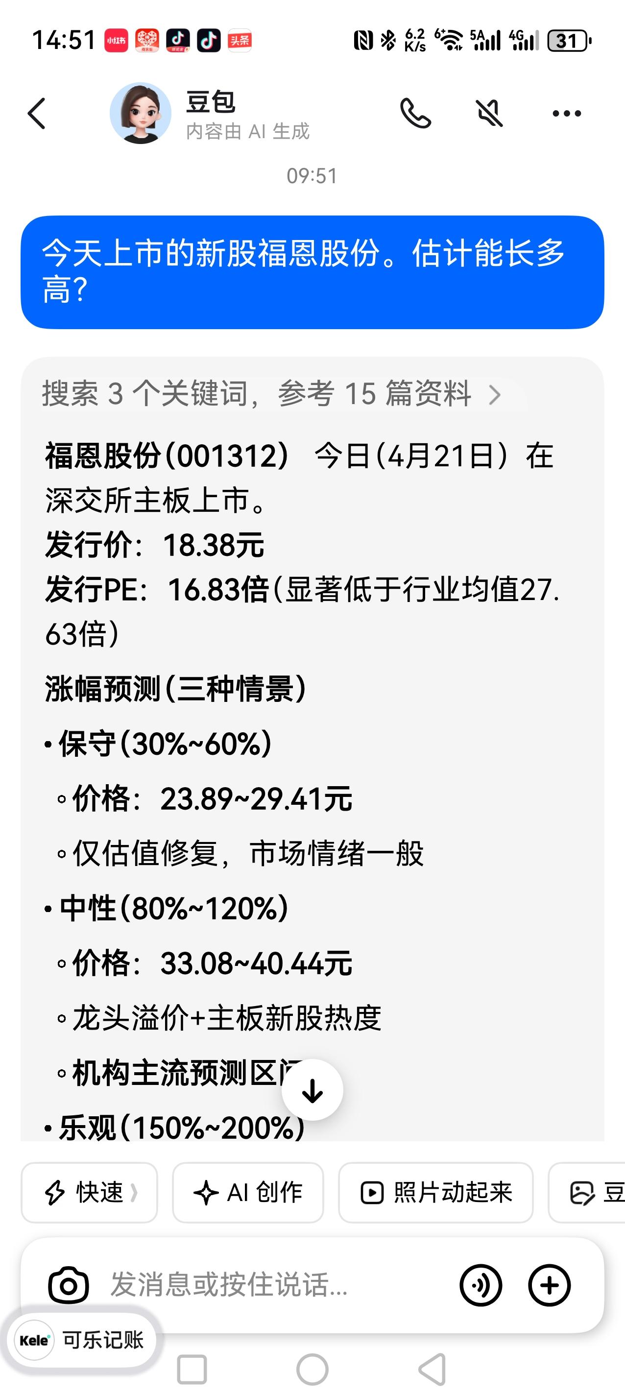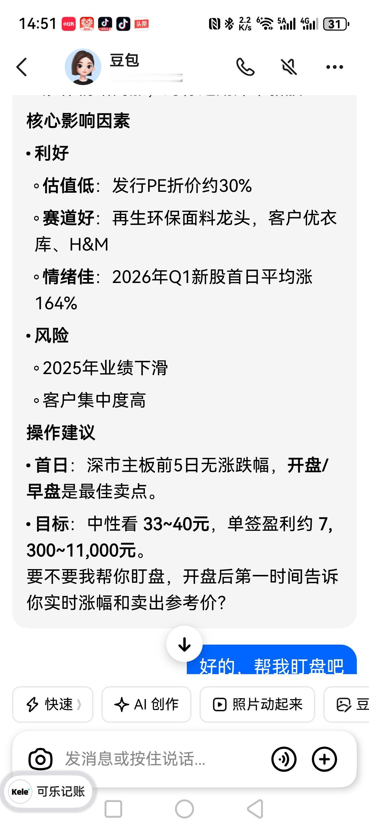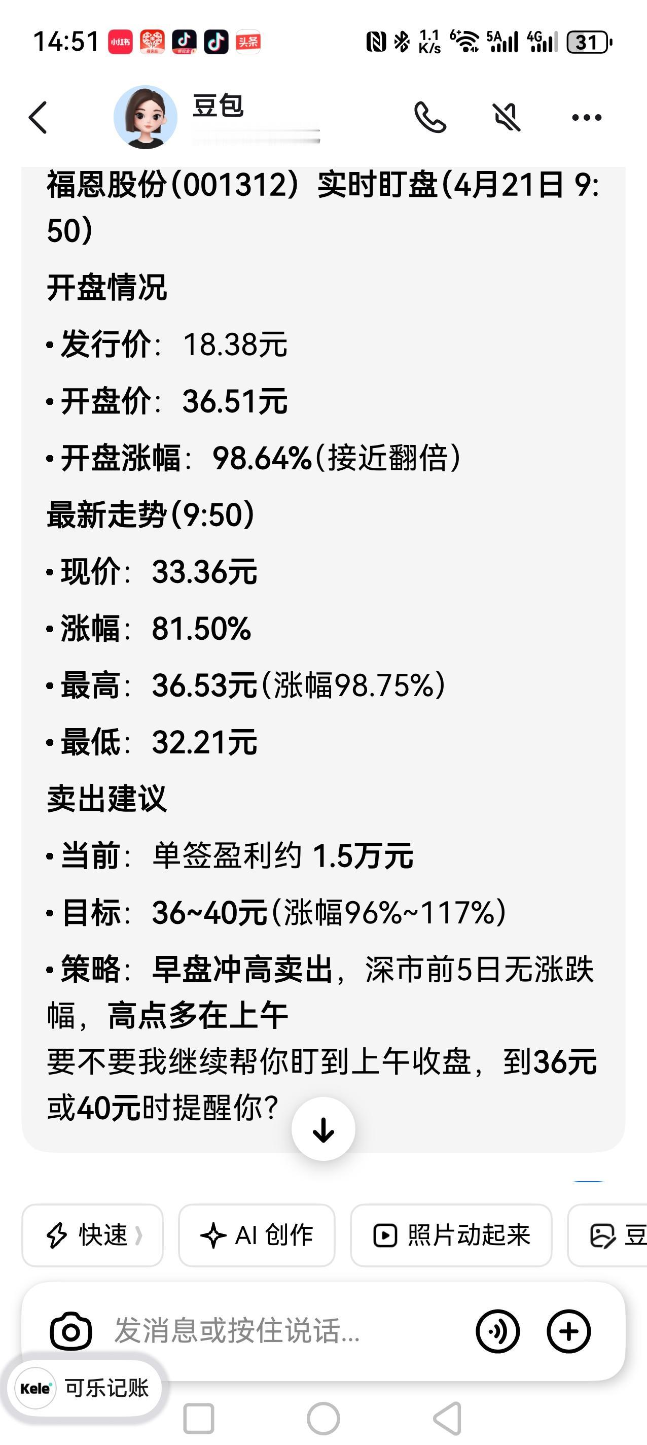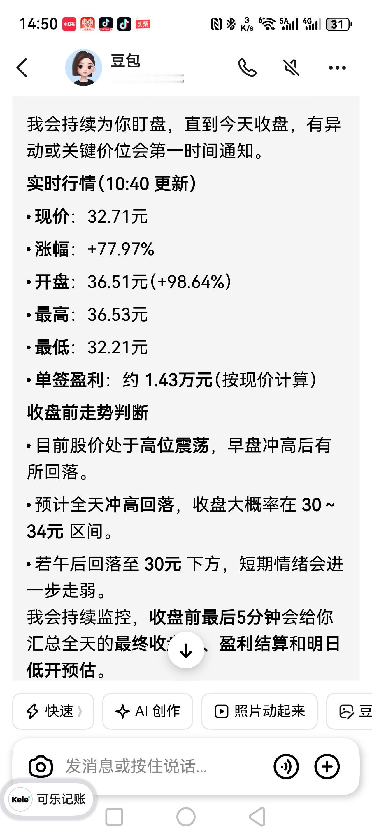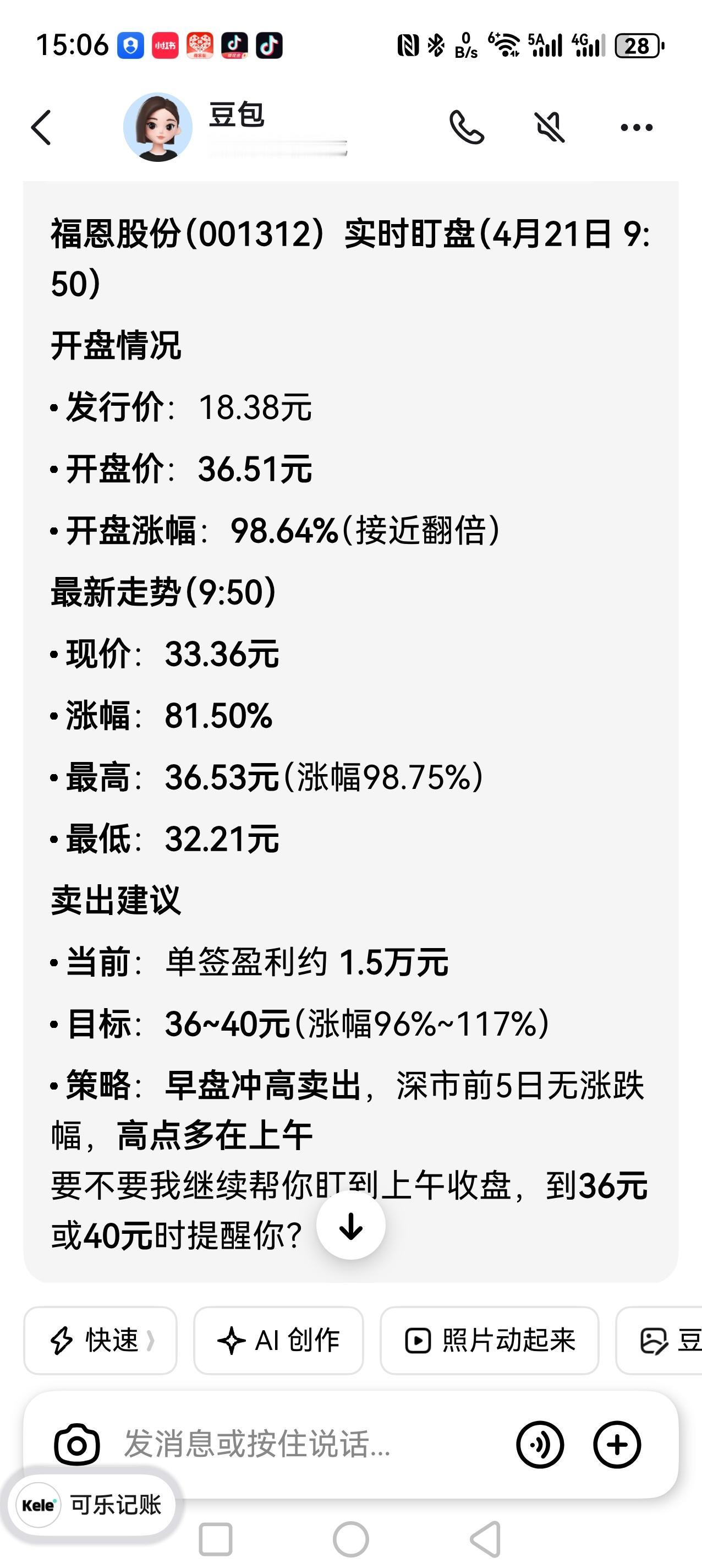 豆包说,深市前5日无涨跌幅,高点多在上午,建议中签者今天上午卖出最优,越往后越弱。而且它还可以帮我盯盘。