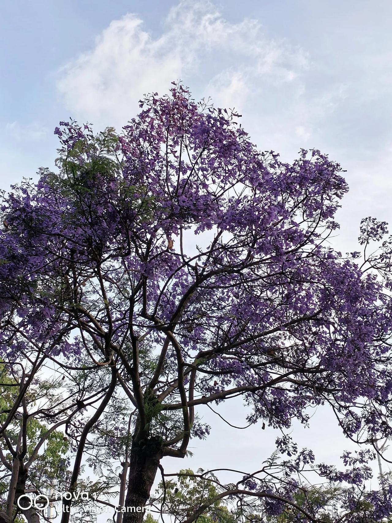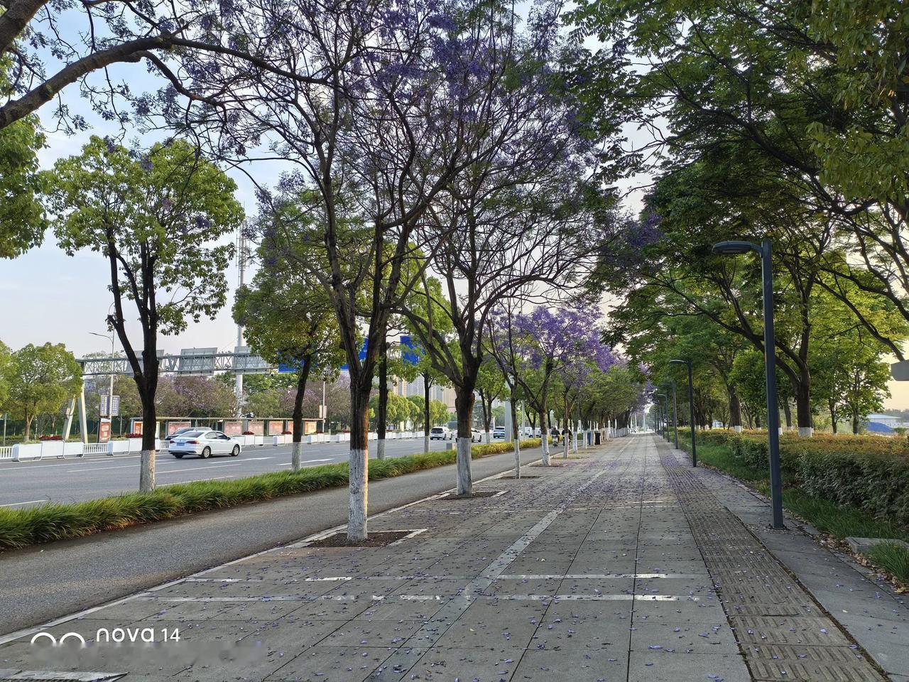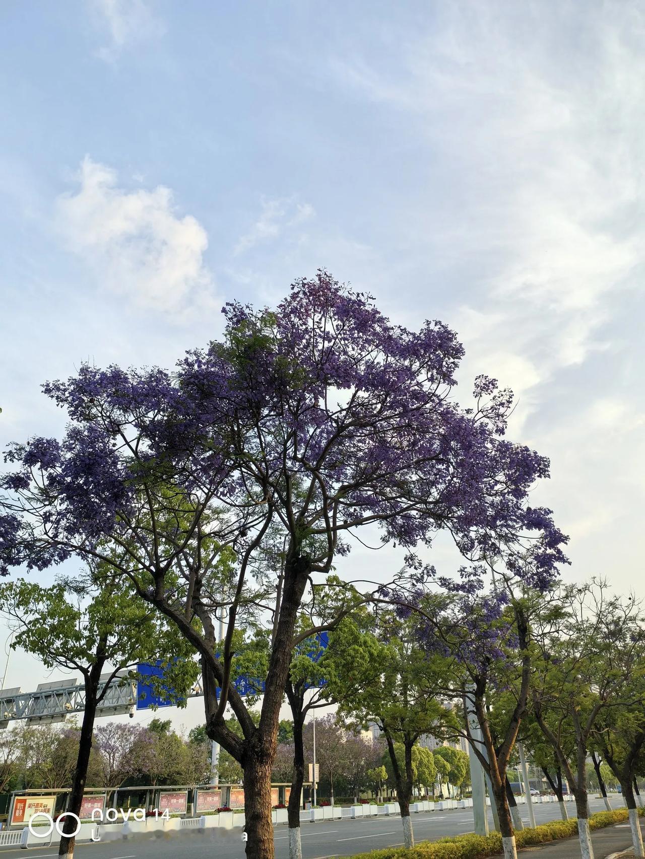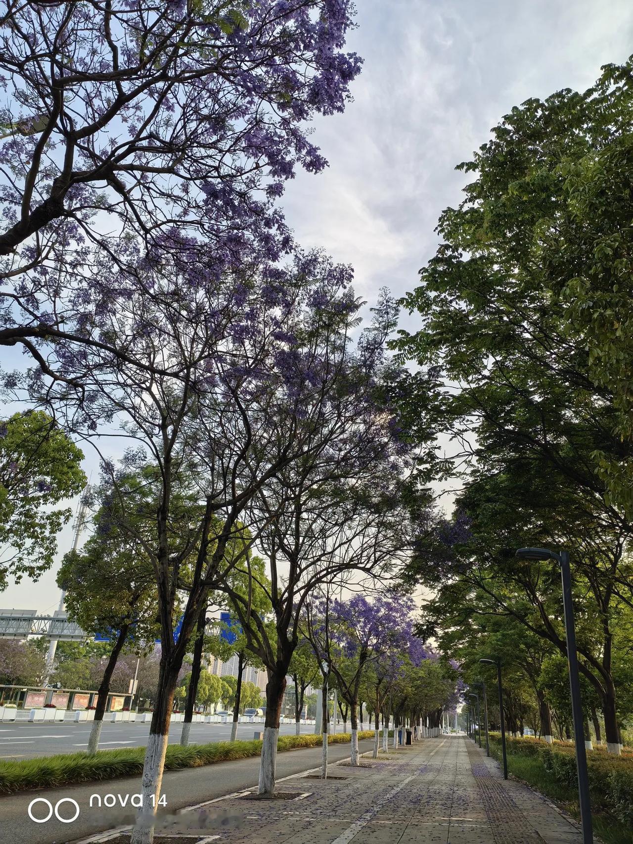 一侧是车水马龙的城市脉络,一侧是繁花静开的温柔景致。蓝花楹不似繁花那般热烈张扬,只用一抹清雅的紫,将喧嚣轻轻抚平。行人放慢脚步,抬眼望这满树繁花,看流云在花枝间游走,城市的匆忙,便在这紫色的温柔里慢慢沉淀。