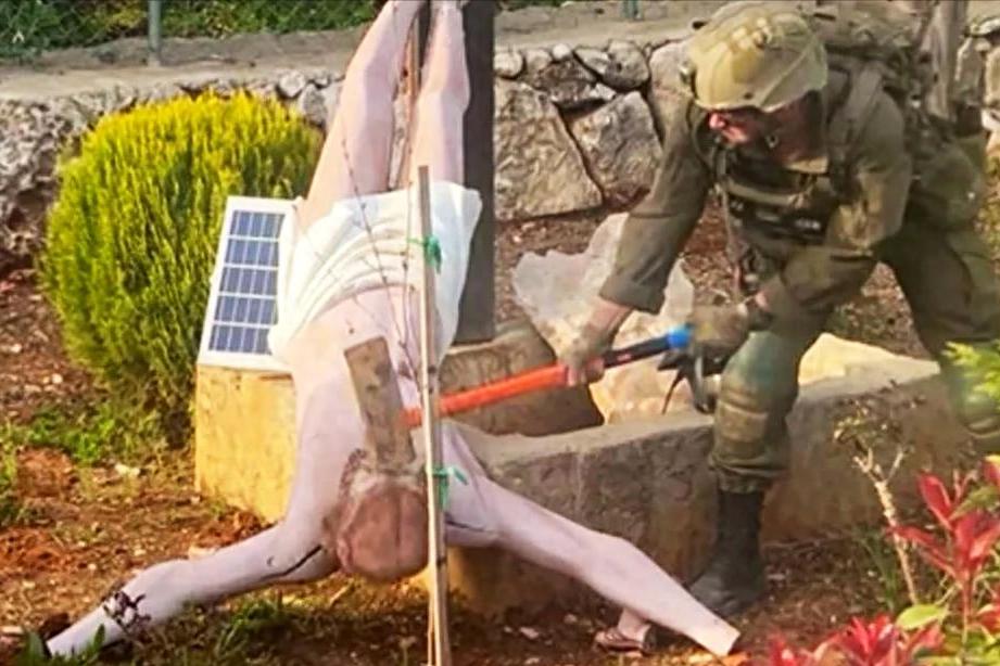 现场画面清晰显示,这名以军士兵先把耶稣雕像从十字架上拆卸下来倒置在地,随后手持大锤狠狠砸向雕像头部,蓄意破坏宗教圣像的行为一目了然。