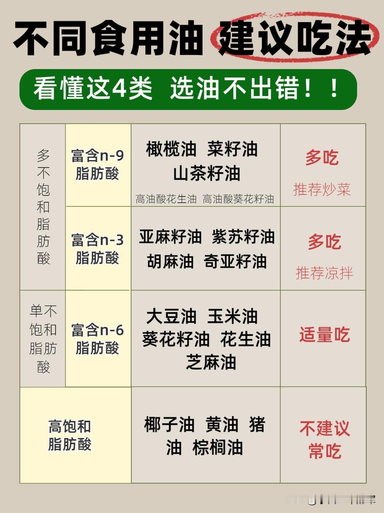 根据脂肪酸类型,食用油可以分为4大类,吃法和推荐度各不相同:
