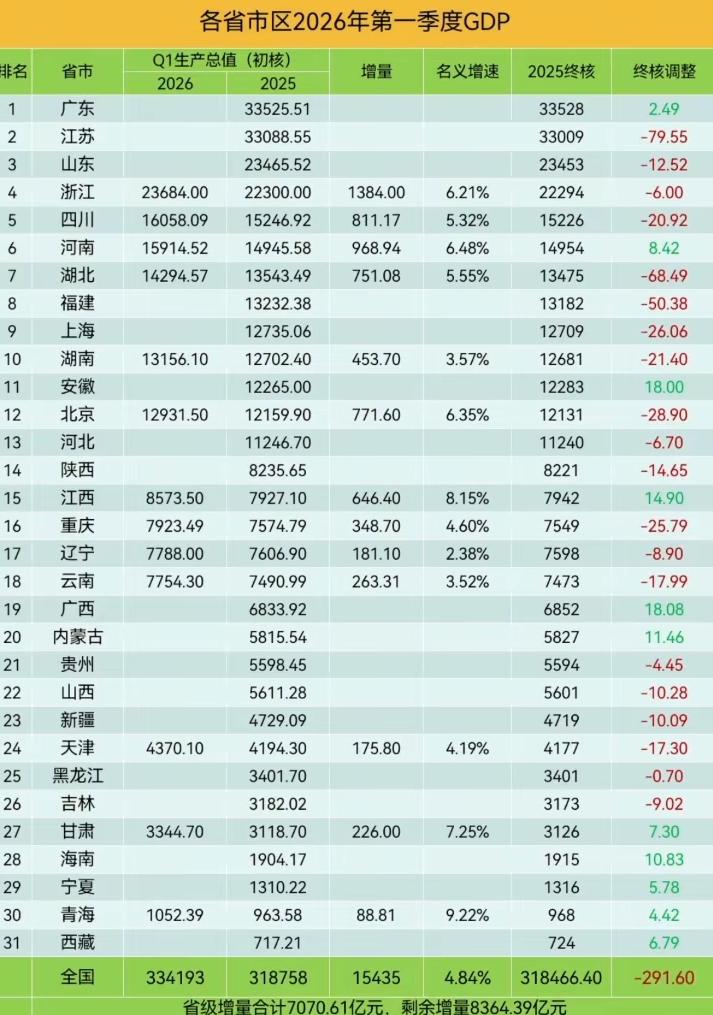 2026第一季度经济成绩单已经有13个省市公布了自己的结果,目前浙江排在第一位,经济总量为23684亿增量为1384亿,也是目前公布的里面第一,而增速的话浙江名字增速6.21%,不算低,但是青海以9.22%的增速暂时位居第一,第一季度目前公布的13个省市里辽宁和云南增速最低,尤其辽宁倒数第一,其增速只有2.38%,增量也才181亿,目前还有十几个省市没出,预计到时候全出时青海不是最高的,辽宁也不是最低的!