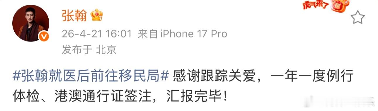 张翰回应去移民局张翰回应就医后去移民局下午,张翰发文就张翰就医后前往移民局作出回应:“感谢关爱,一年一度例行体检、港澳通行证签注,汇报完毕! ”