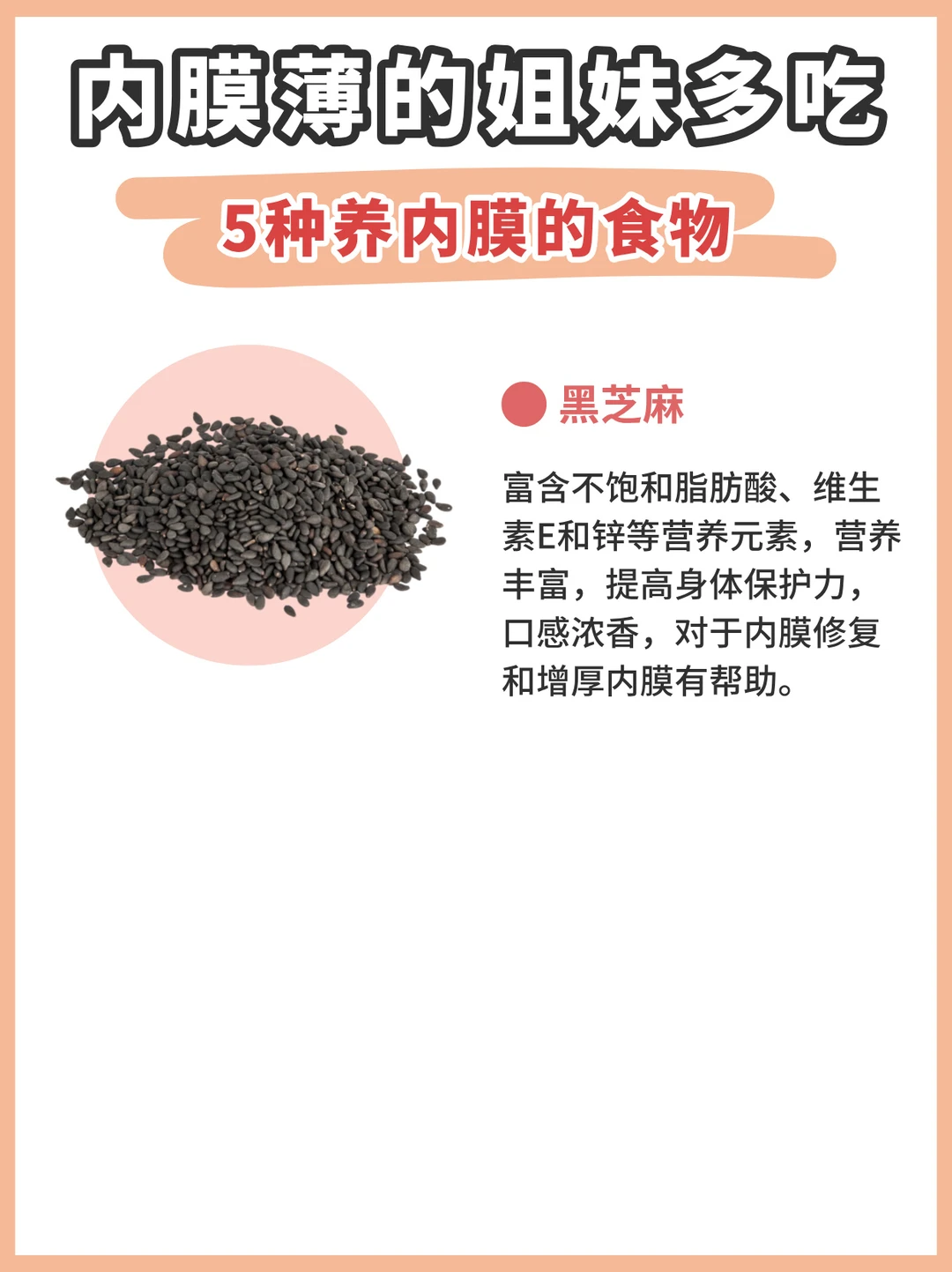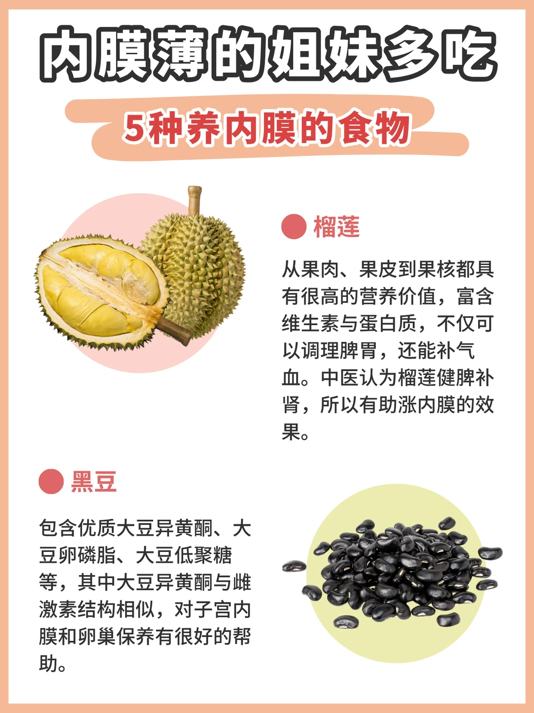 [四R]黑豆:内膜薄的姐妹日常可以多吃一些豆制品,比如每天早餐可以喝一杯无糖黑豆浆,菜式上增加豆腐、豆干、腐竹等食材。但是脾胃不好的姐妹,不适合天天喝豆浆哦,每周喝3-4次即可。