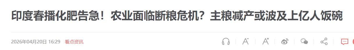 联合国粮农组织3月下旬发布报告明确预警,若尿素缺口持续至春耕结束,印度主粮作物将减产15%-20%,相当于上亿人口一年的基本口粮面临短缺,粮食安全危机一触即发。