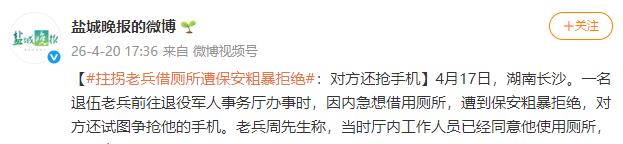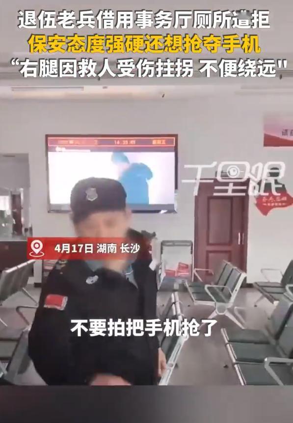 2026 年 4 月 17 日下午,一位因服役负伤、依靠拐杖出行的退伍老兵,来到湖南省退役军人事务厅办理个人业务。办理过程中,老兵突发内急,便礼貌向门口保安提出,临时借用厅内公共卫生间应急。