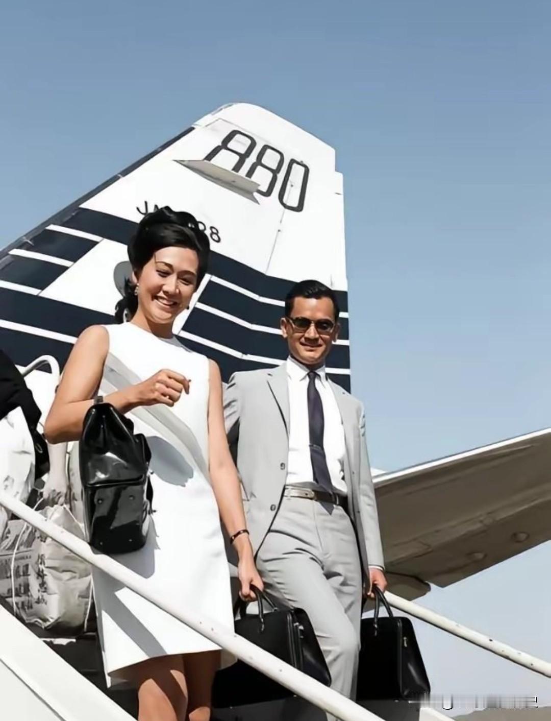 二人携手走下舷梯,画面不仅定格了新婚夫妇的甜蜜,也留存下那个年代名流出行时的从容风度。