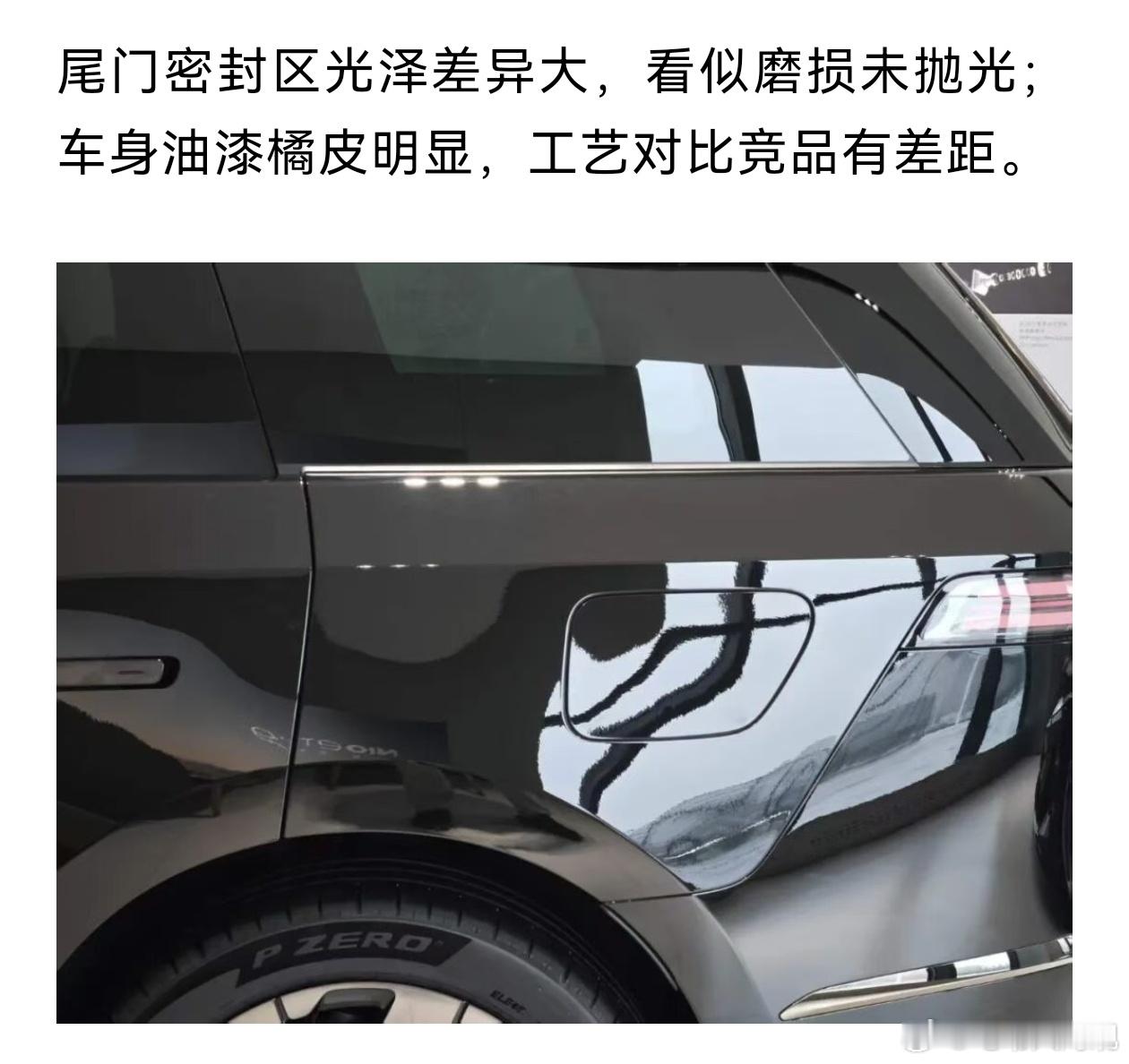 pq最严厉的教父pq小课堂 评论区有网友在问黑色漆面橘皮的事先看他拍的这张照片强光直射+近距离怼脸拍本身就是故意找瑕疵的角度就像把人脸凑到镜头前拍毛孔再好看的人也能拍出所谓的“皮肤瑕疵”首先说充电口盖的问题他拍的刚好就是这个位置懂点车的都知道充电口盖是独立配件和车身不是一起喷漆的单独喷、单独装板材厚度、曲面弧度都不一样喷漆烘烤的温度也有差别有点轻微光泽、色差差异是所有车都有的正常现象行业里都允许拿这个说工艺差纯属不懂装懂再说说密封区光泽不一这个位置常年贴着密封条橡胶条长期按压本来就会留下轻微的接触印再加上曲面弧度变了光线一照反光本来就不一样不是磨损更不是没抛光但凡开过车的都知道这是再普通不过的细节重点讲车漆橘皮这是最基础的PQ常识所有量产车原厂漆都有橘皮没有任何一台车能做到绝对镜面别被网上的精修图骗了那都是打光+滤镜+后期的效果而且有个关键规律车越大,橘皮越难控制大车车身长、曲面多喷漆的时候漆料流平、烘干难度翻倍就像画小画很容易画均匀画一幅大壁画难免有细微笔画差异小车车漆看着均匀不是技术多逆天是它车小、车身曲面简单天生好控制拿小车的漆面标准去要求全尺寸大型SUV本身就不不公平